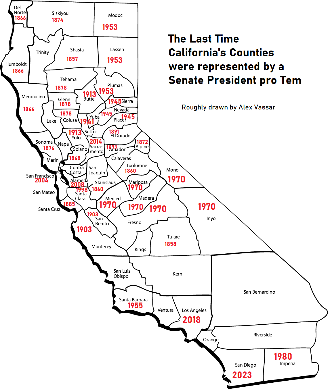 Senator Mike McGuire is from Sonoma County. The last Senate Pro Tem from Sonoma was Benjamin F. Tuttle in 1876. The only other Senate pro Tem from his district was in 1866, when Stephen P. Wright (representing Del Norte and Humbolt counties) served as Senate President pro Tem.