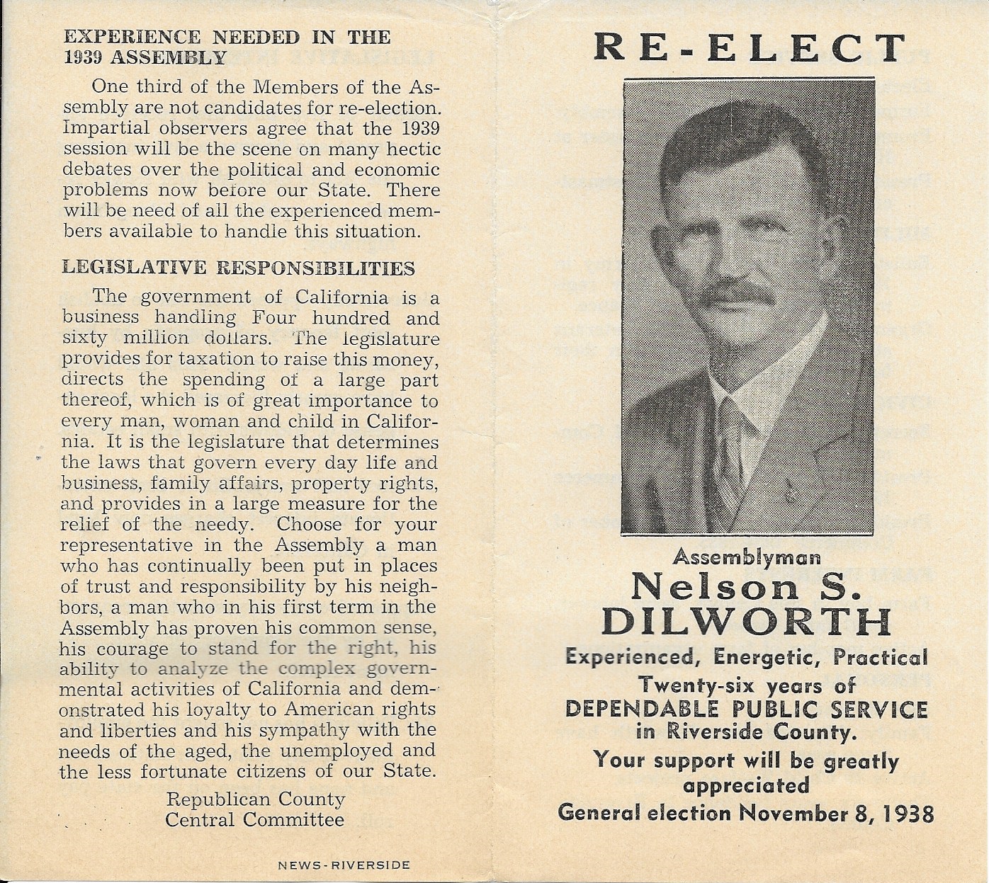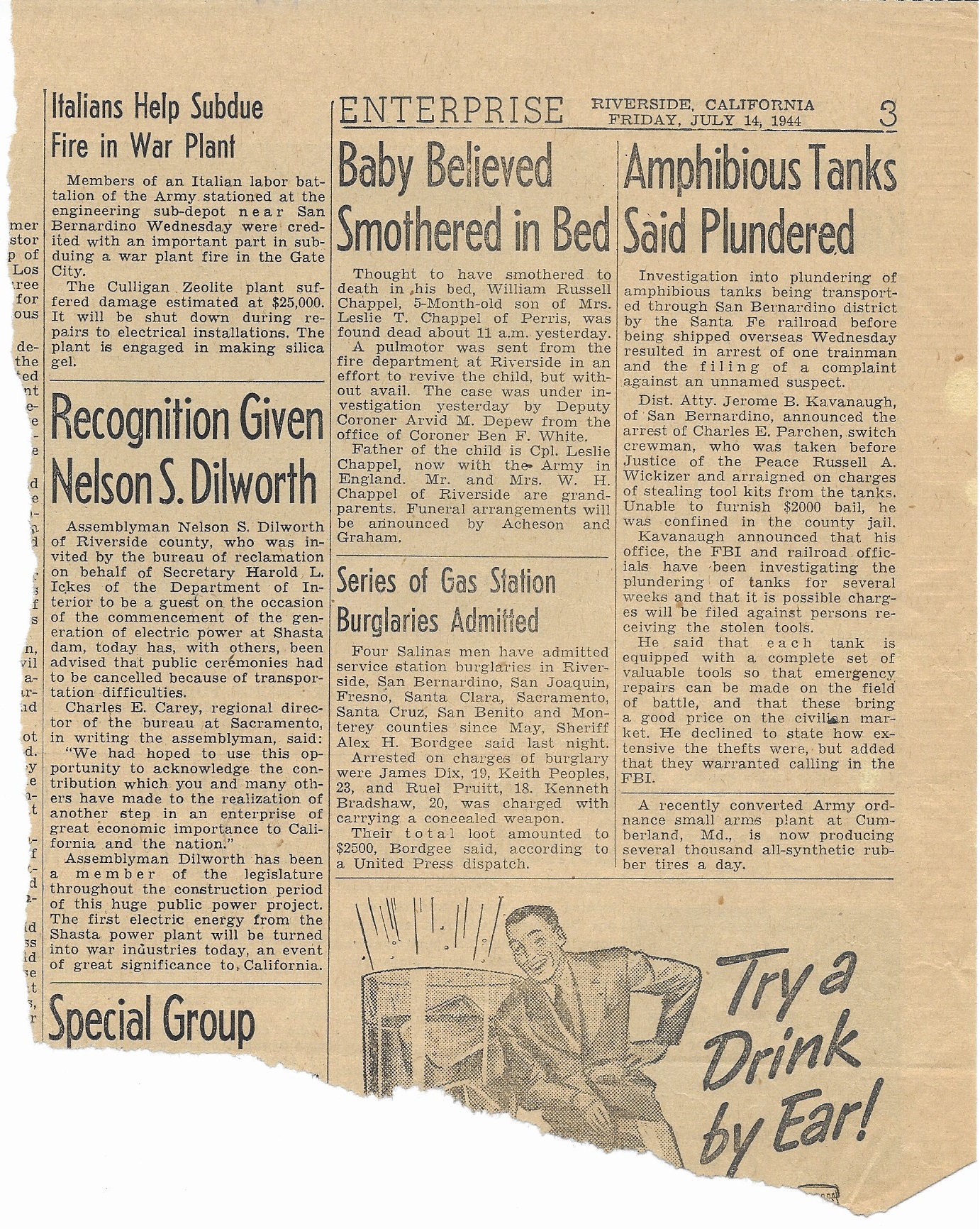 - A newspaper clipping from the Riverside Press Enterprise in 1944 about Assemblyman Nelson Dilworth.