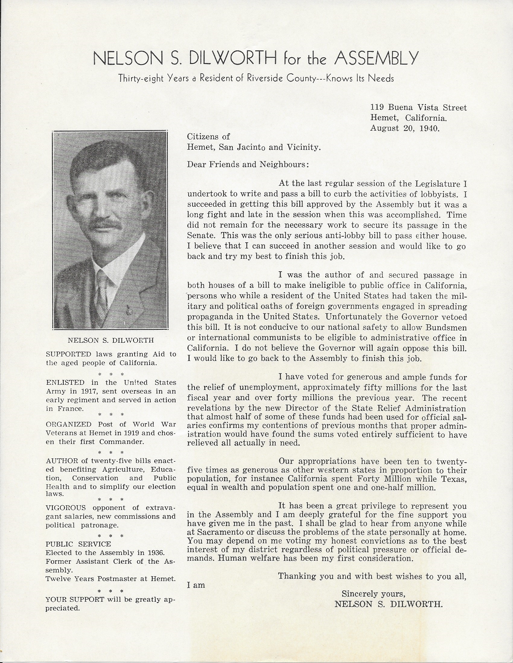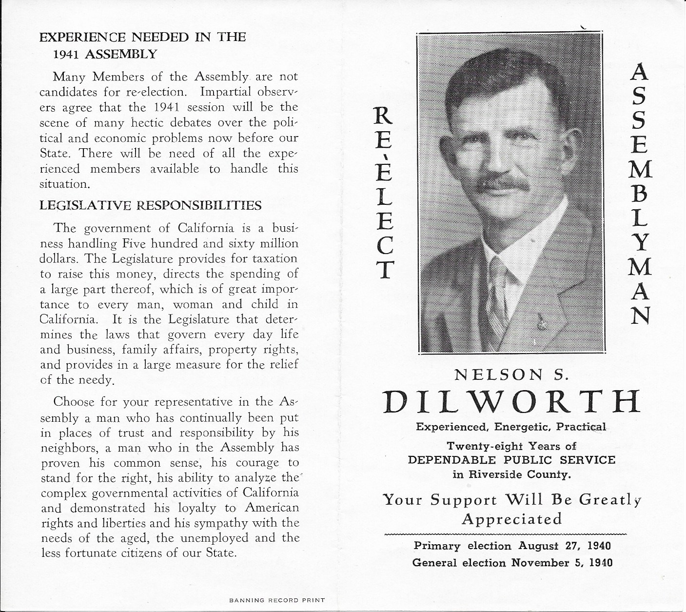 State Senator Nelson S. Dilworth was born June 27, 1890 in East Palestine, Ohio. He moved to California as a child, and served as the Assistant Journal Clerk of the State Assembly for the 1915 session. Soon after, Dilworth enlisted in the Army and served in France during World War I.