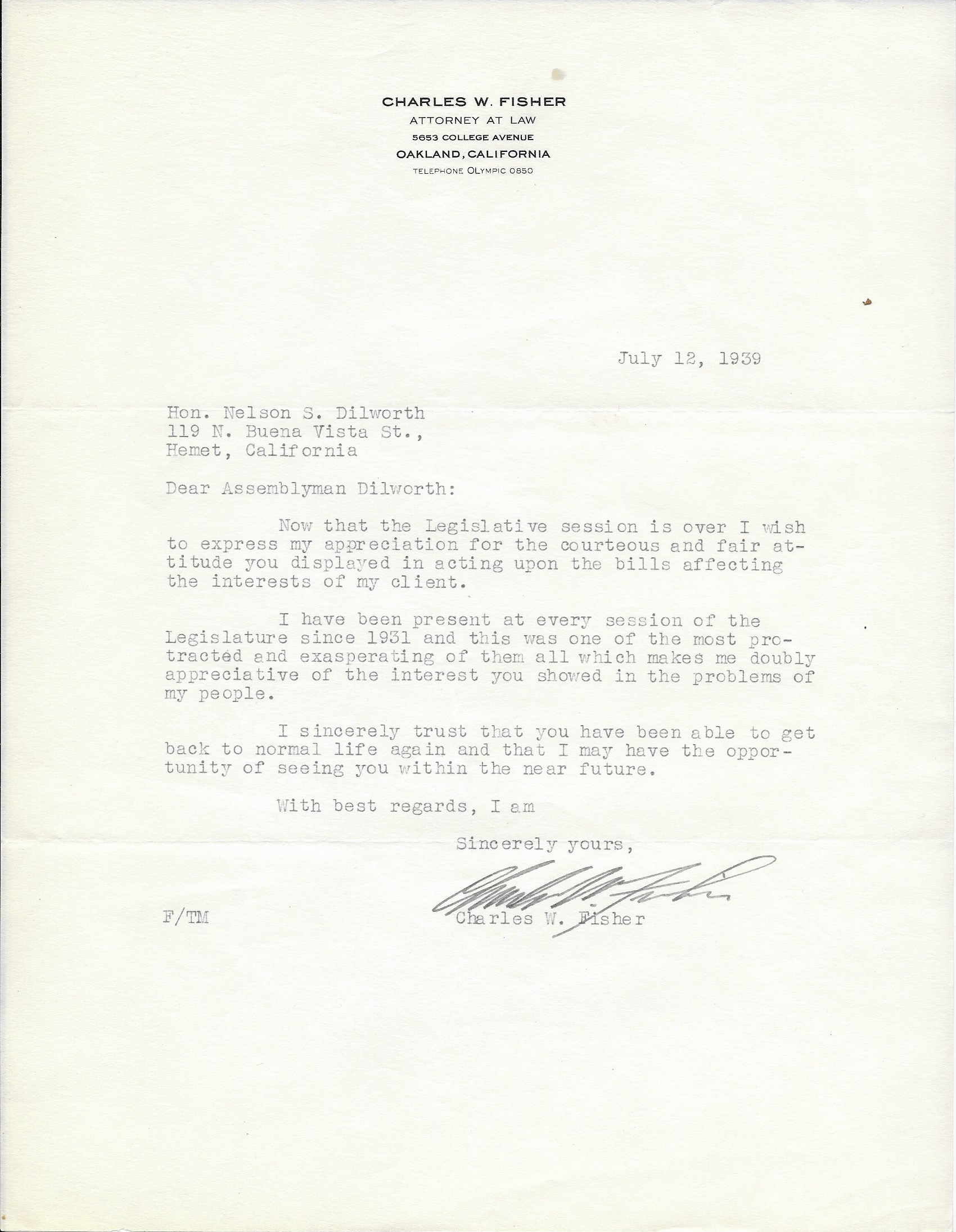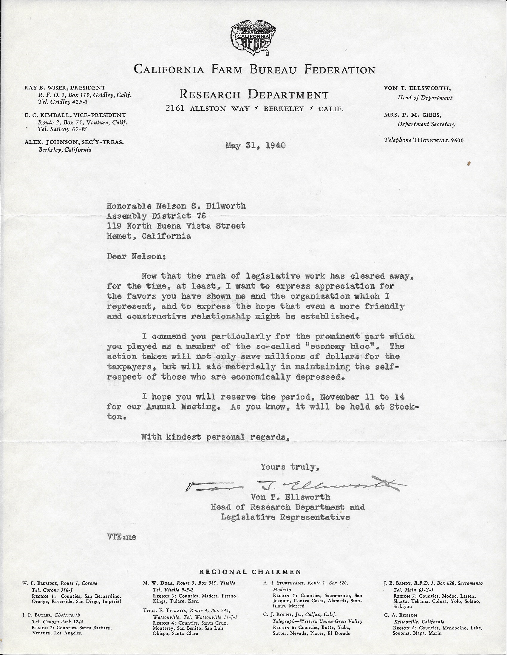 - A 1940 letter from Von T. Ellsworth of the California Farm Bureau Federation to Dilworth at the conclusion of the 1940 session.