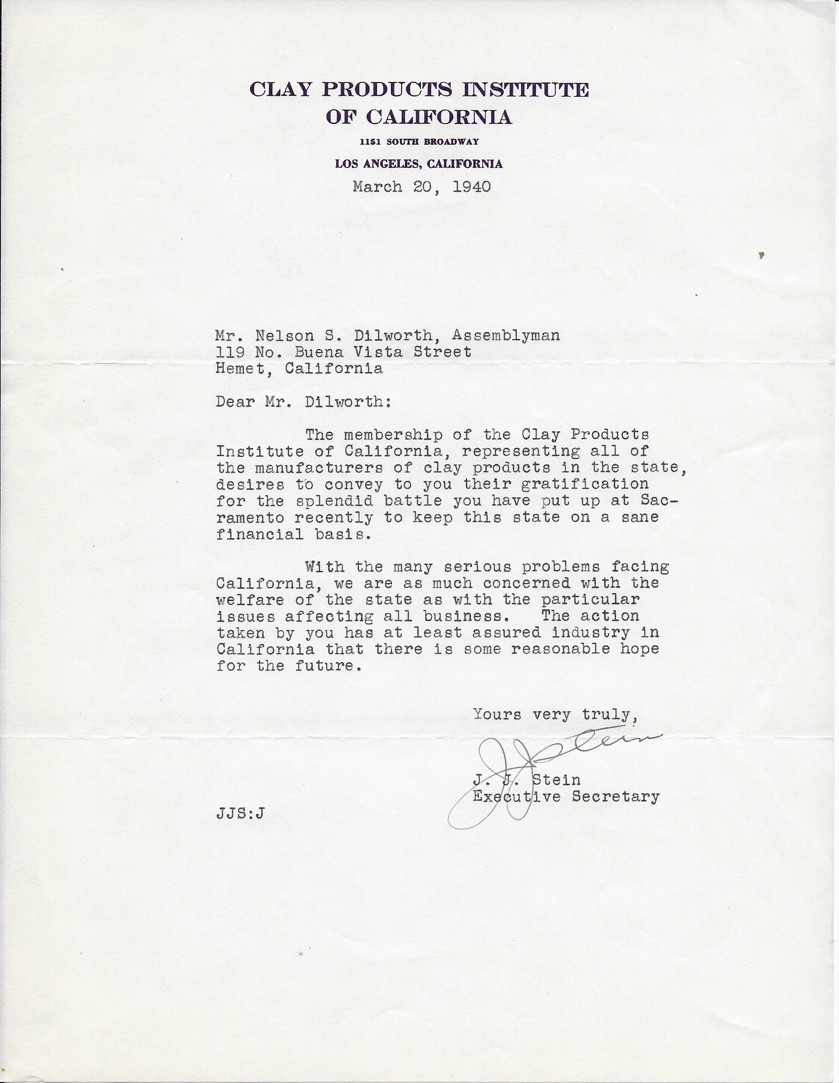 - A 1940 letter from J. J. Stein of the Clay Products Institute of California to Dilworth at the conclusion of the 1940 session.