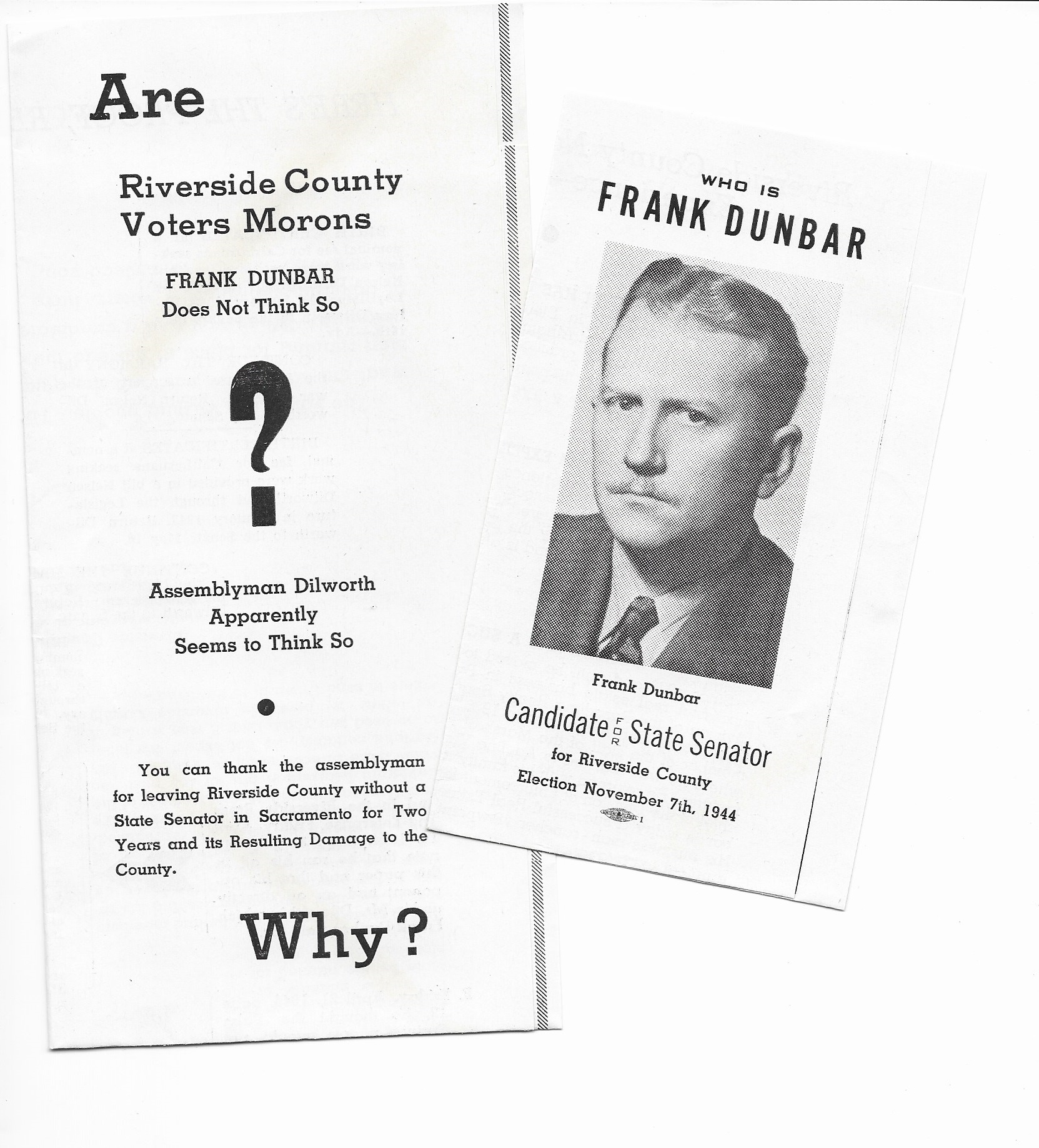 - Campaign materials for State Senate candidate Frank Dunbar, Dilworth’s opponent in the 1944 campaign.