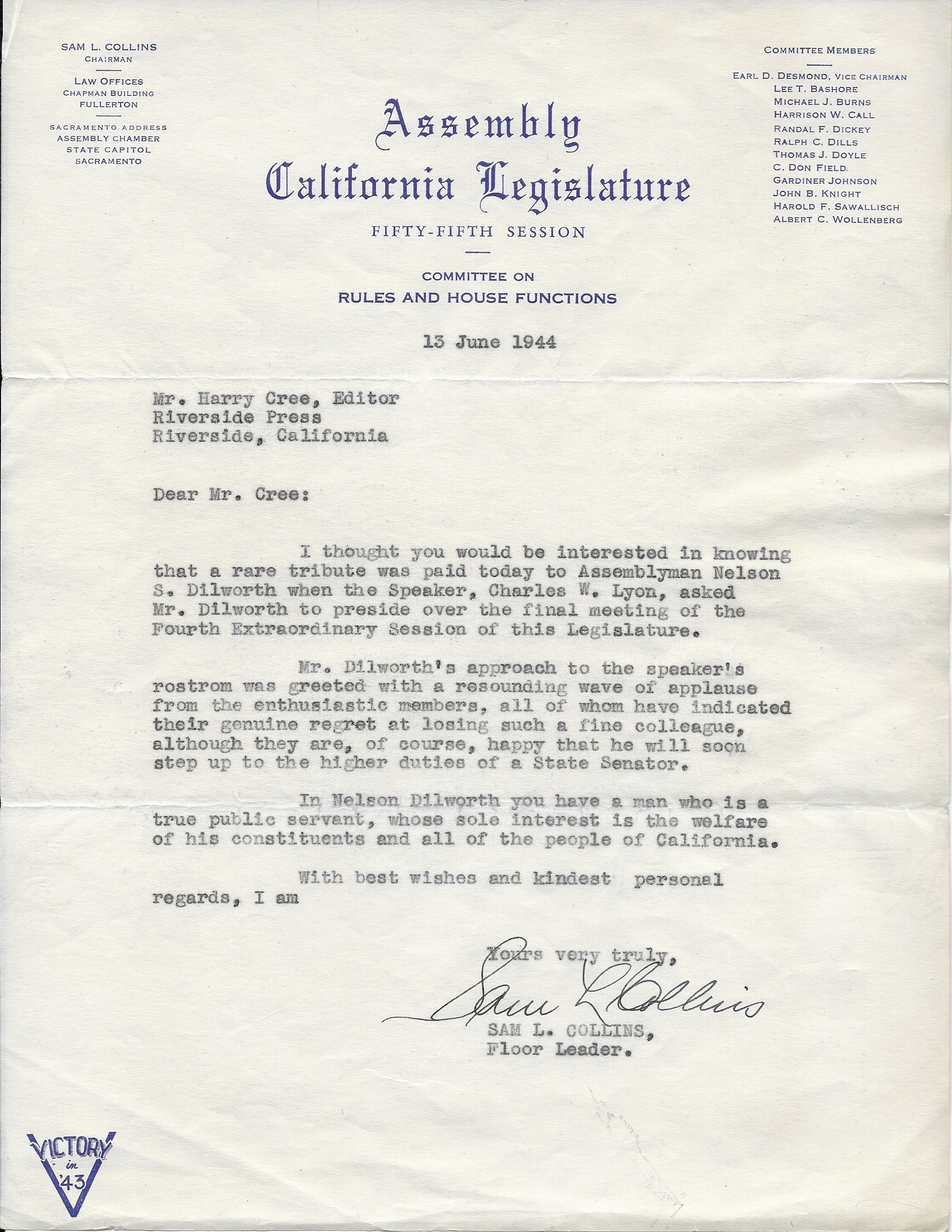 - A letter from Assembly Speaker Sam L. Collins to the editor of the Riverside Press Enterprise about Dilworth acting as presiding officer in the Assembly (1944)