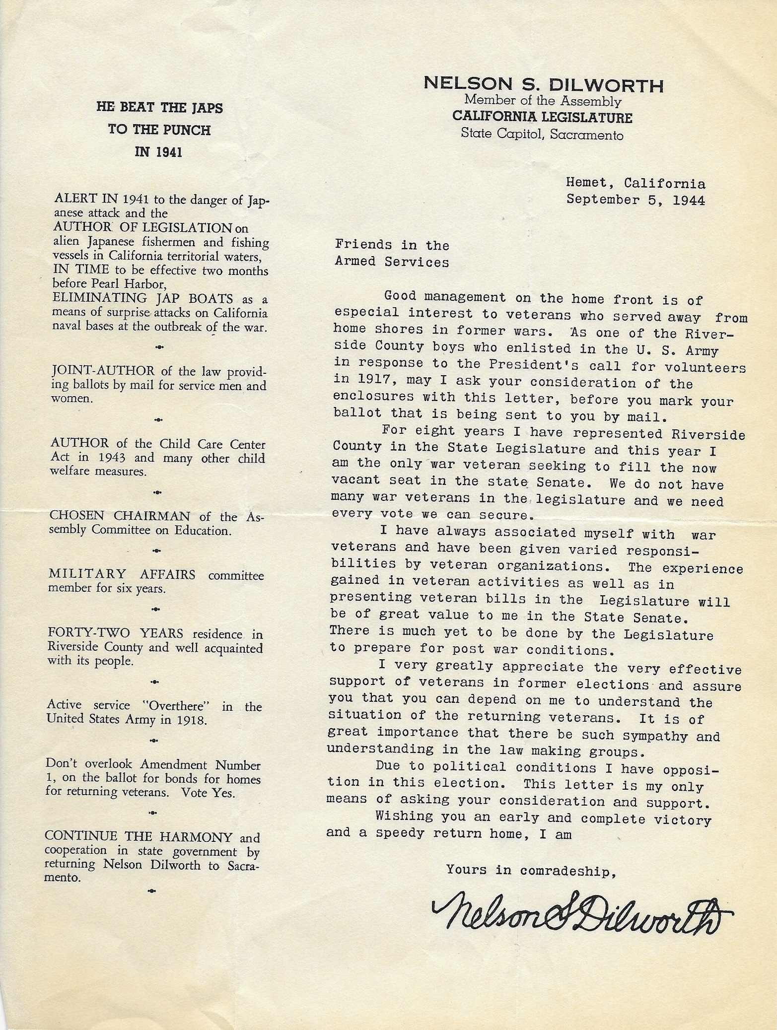 Dilworth served a total of 24 years in the state legislature and with a strong legislative focus on education and American citizenship, including service on the Education Committees in both the State Assembly (1941-1944) and State Senate (1945-1960) and authored a number of important education bills including the creation of the Institute for Cancer Research at the University of California and the construction of the University of California at Riverside campus. According to Senator Stanford Shaw in his oral history interview (p. 169), by the late 1950s, Dilworth had earned the nickname “Mr. Education.”