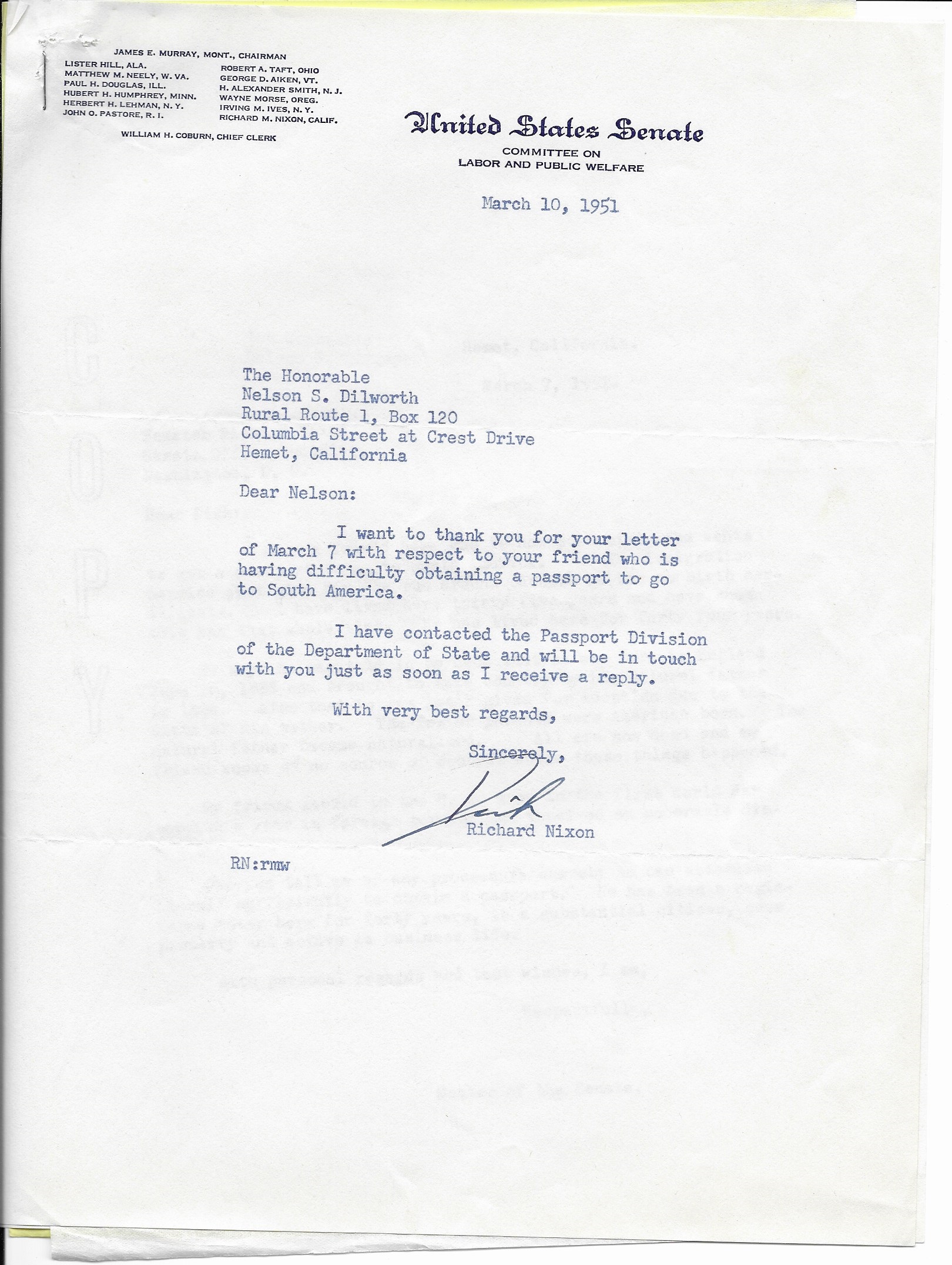 - A 1951 letter from U.S. Senator Richard Nixon thanking Dilworth for his work to resolve a constituent who had trouble getting a passport.
