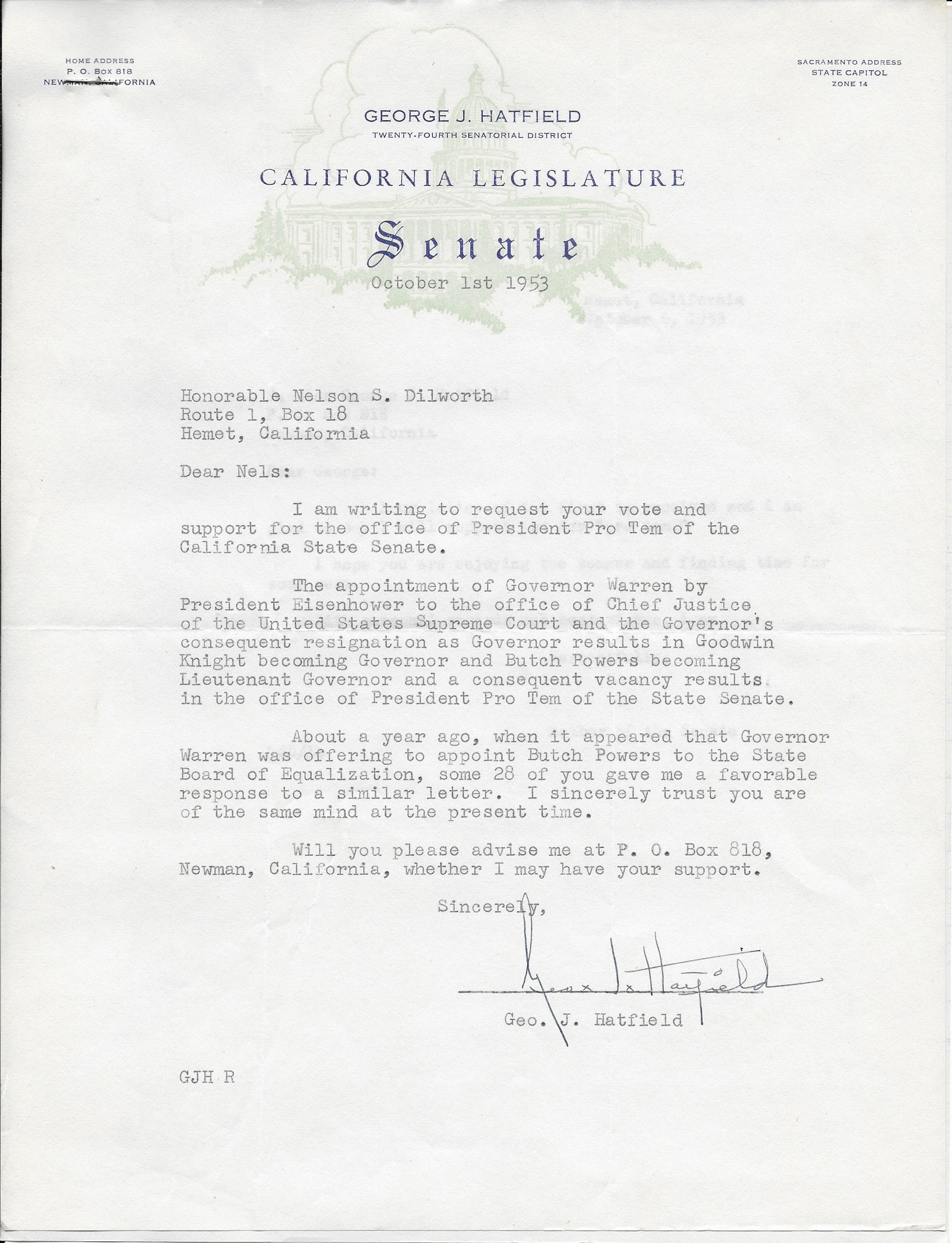 - A 1953 letter from Senator George J. Hatfield expressing his interest in serving as Senate President pro Tem in 1954 and asking for Dilworth’s support.