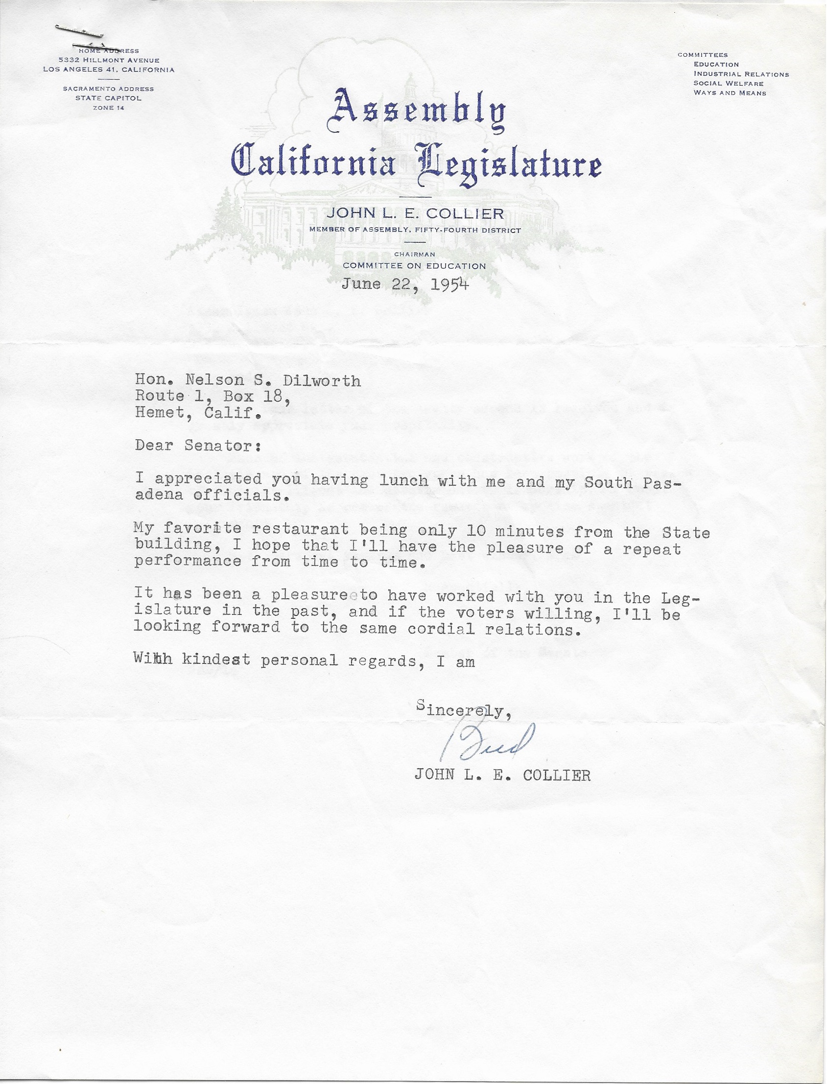 - A 1954 letter from Assemblyman John L. E. Collier thanking Dilworth for a recent lunch. Collier would serve until 1978.