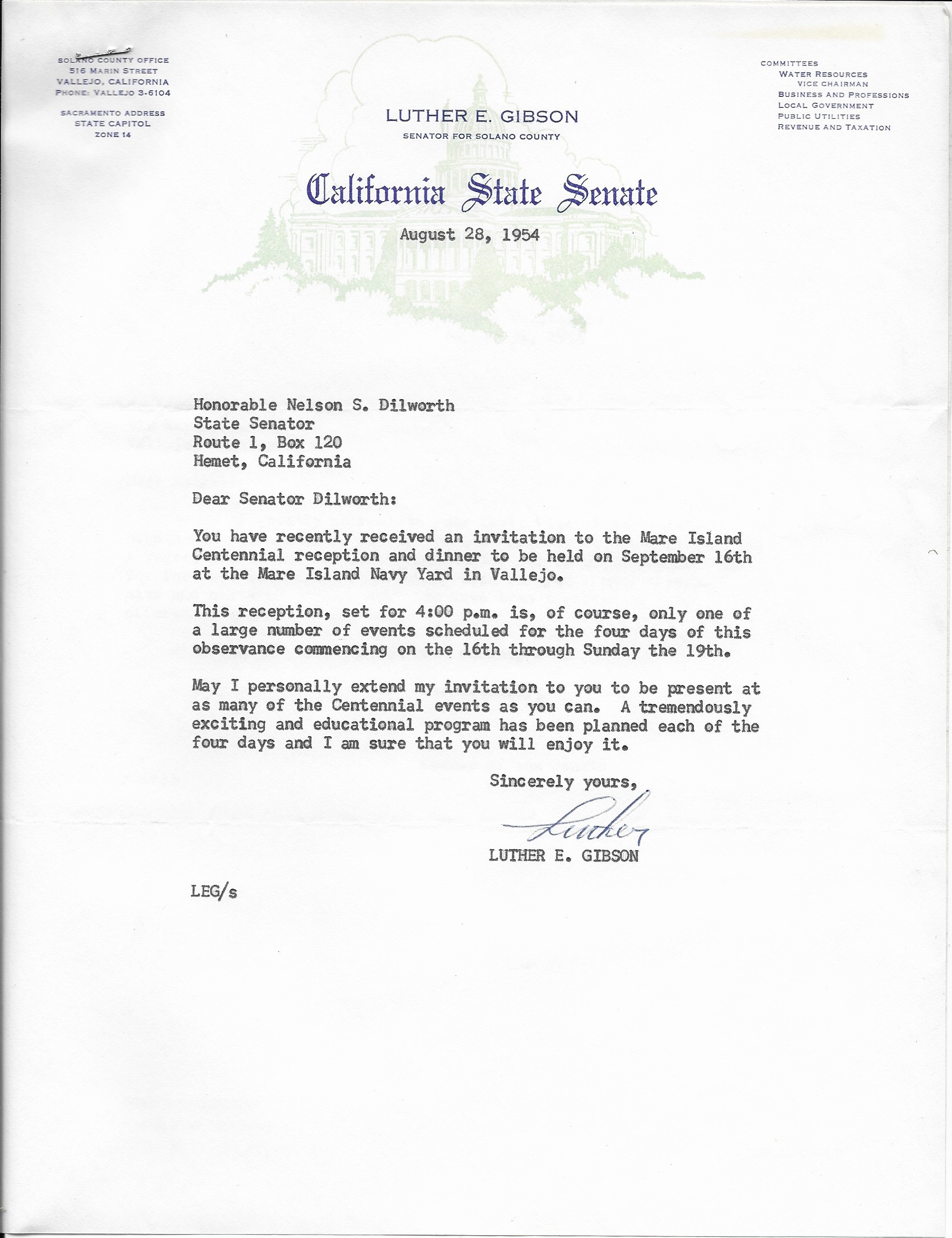 - A 1954 letter from Senator Luther Gibson inviting Dilworth to the Centennial Reception and Dinner for the Mare Island Navy Yard.