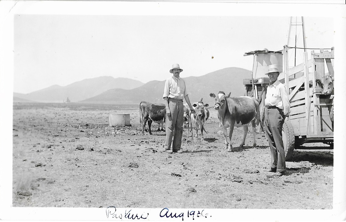 - Nelson Dilworth with one of his cows in a pasture near Hemet (1936).