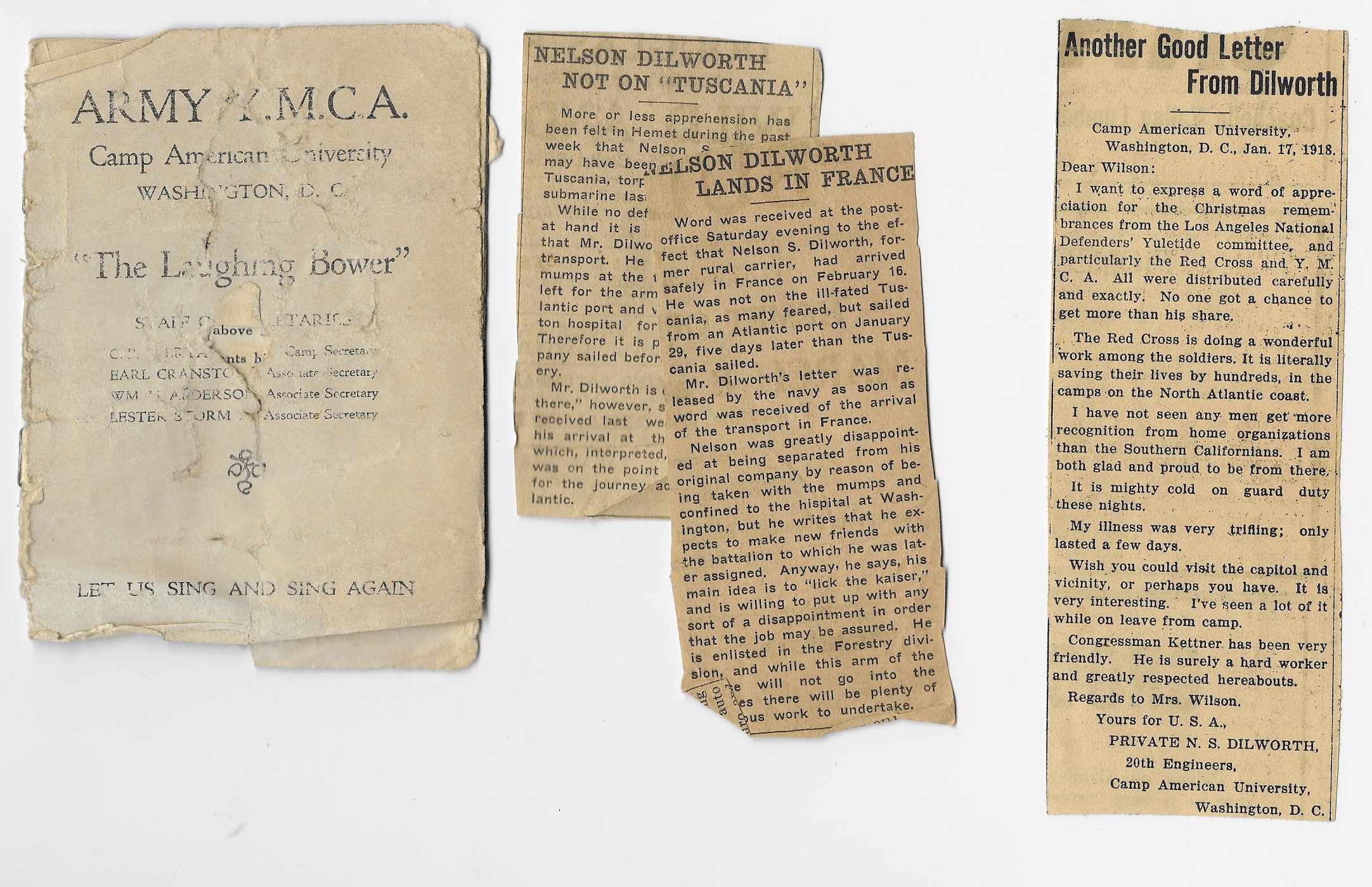 - Dilworth’s songbook from Camp American University and newspaper articles about Dilworth’s WWI service (1918)