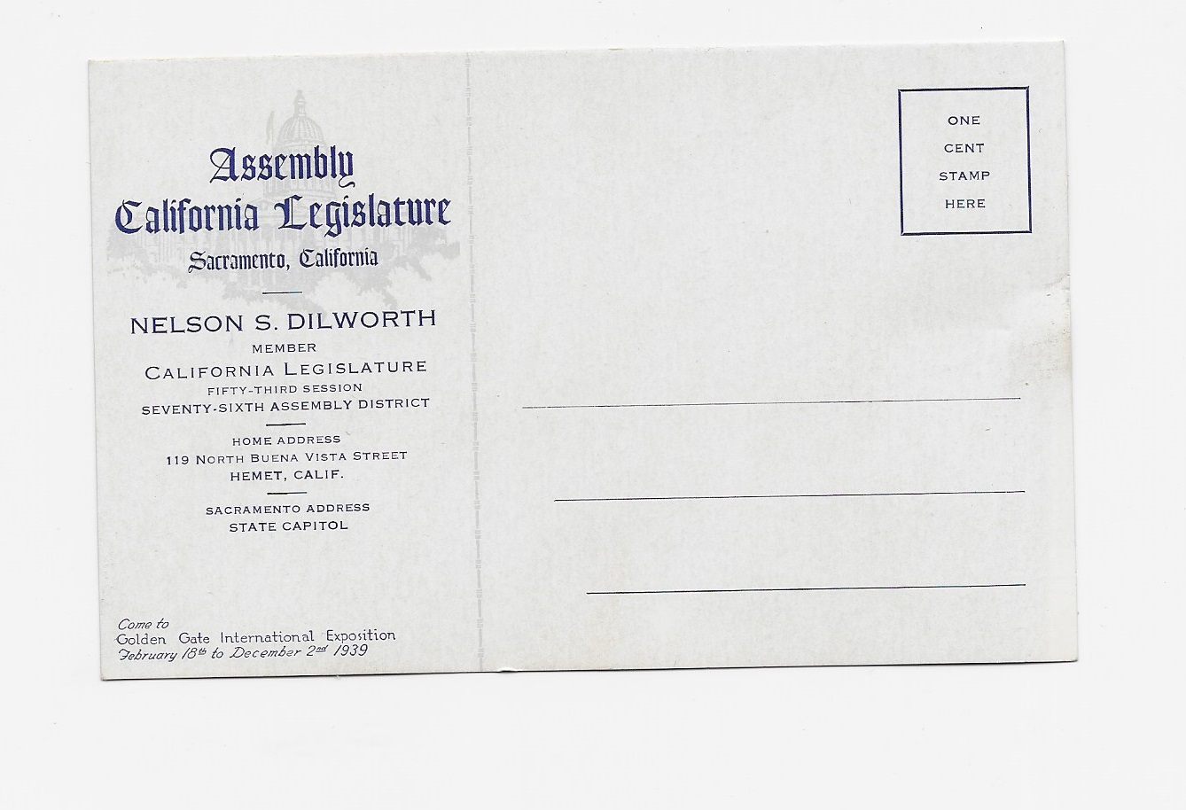 - A 1939 postcard used by Assemblyman Nelson Dilworth (1939)
