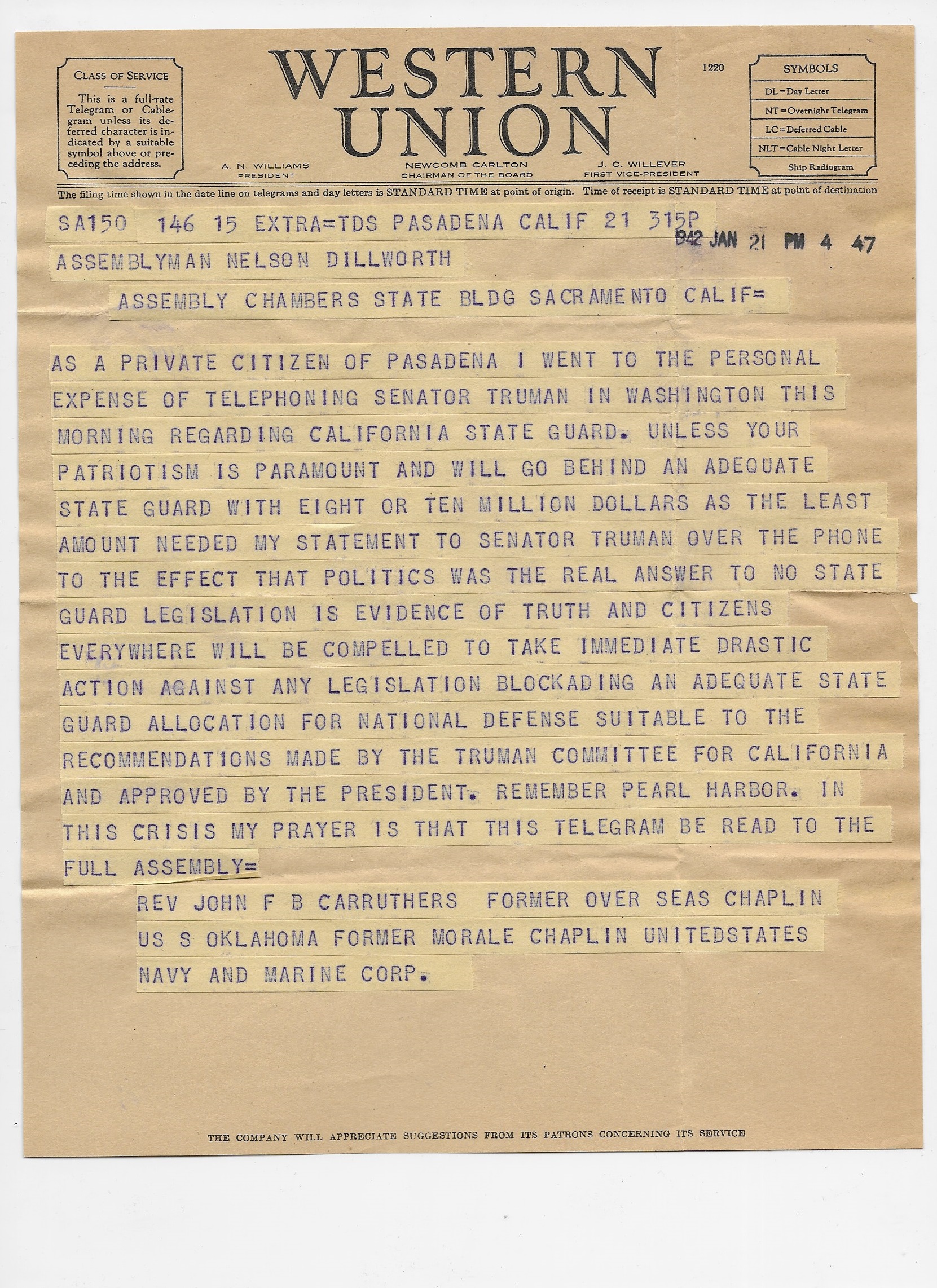 - A January 1942 telegram from the Rev. John Carruthers of Pasadena (who had previously been a chaplain on the USS Oklahoma).