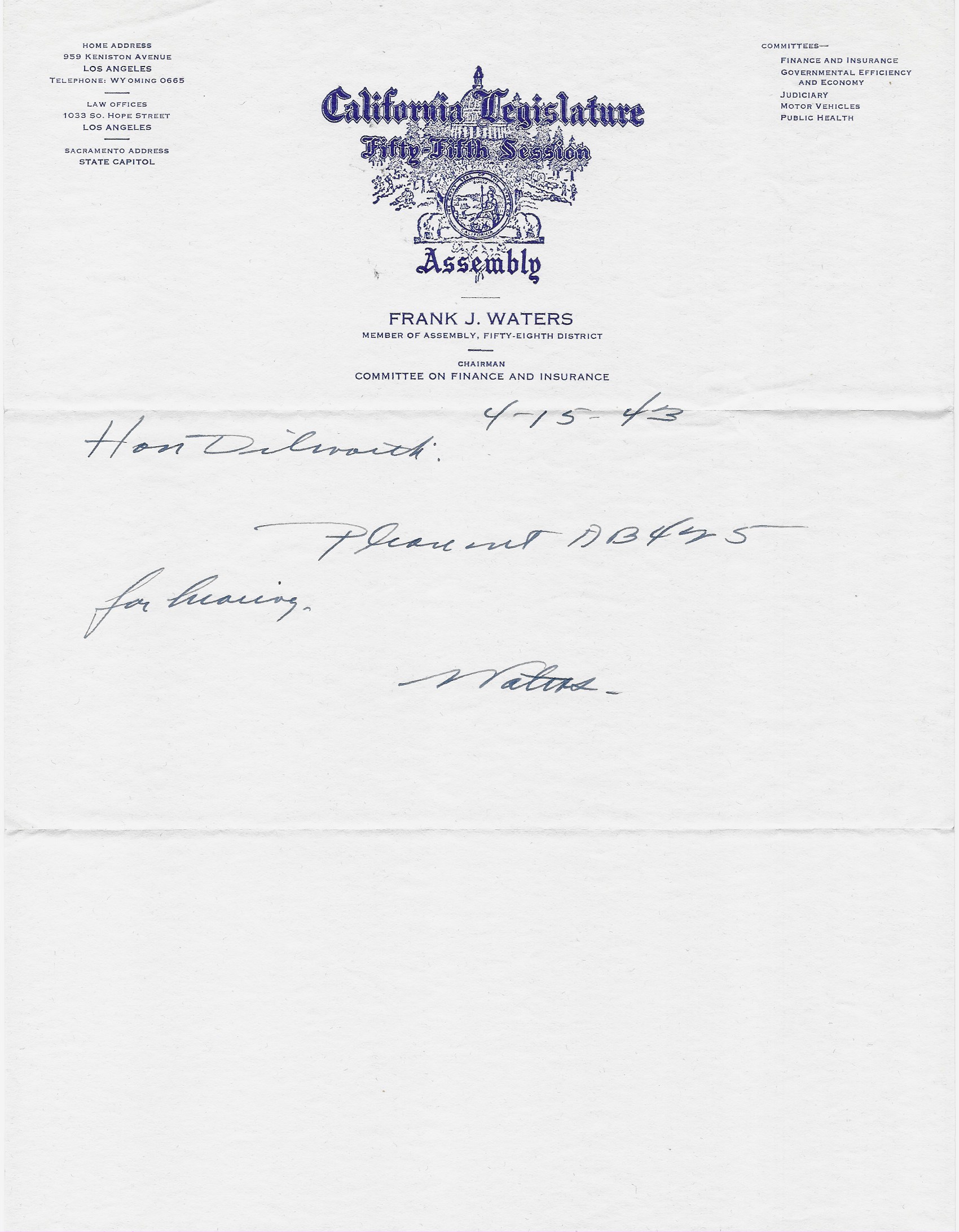 - A letter from Assemblyman Frank J. Waters requesting that his bill (AB 475) be scheduled for a Committee hearing (1943)