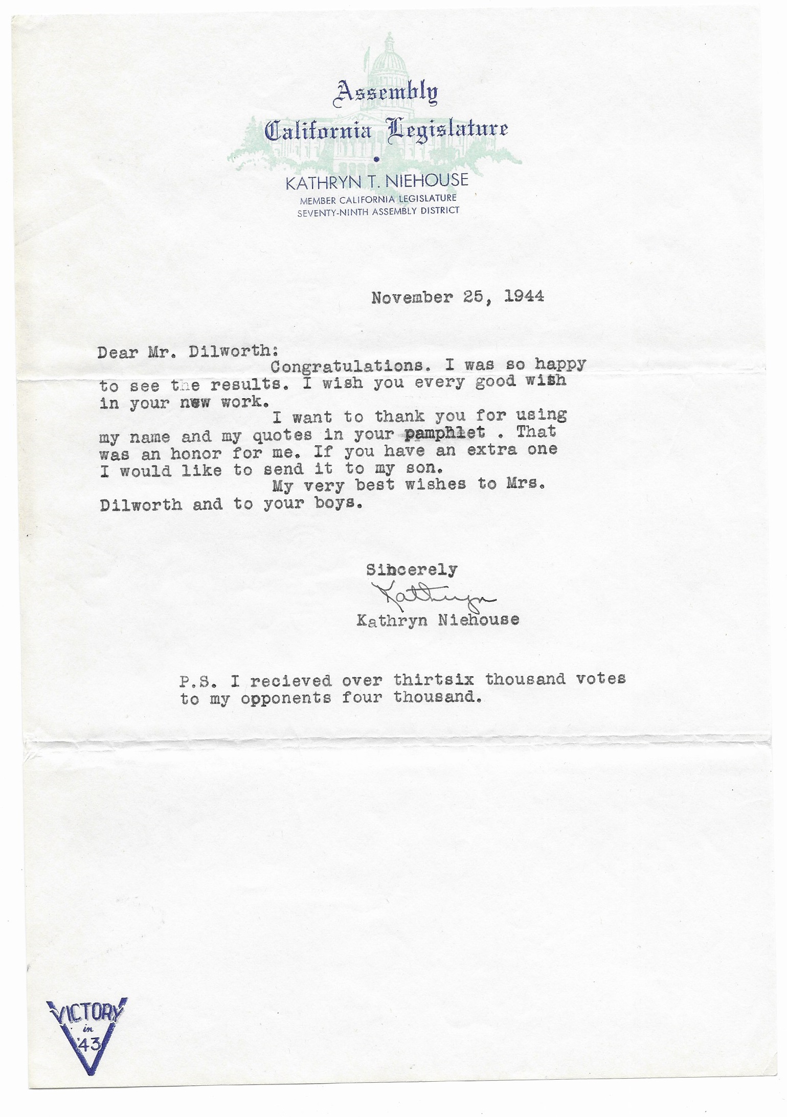 - A letter from Assemblywoman Kathryn Niehouse congratulating Dilworth on his election to the State Senate (1944). Niehouse was the only woman in the legislature during WWII.