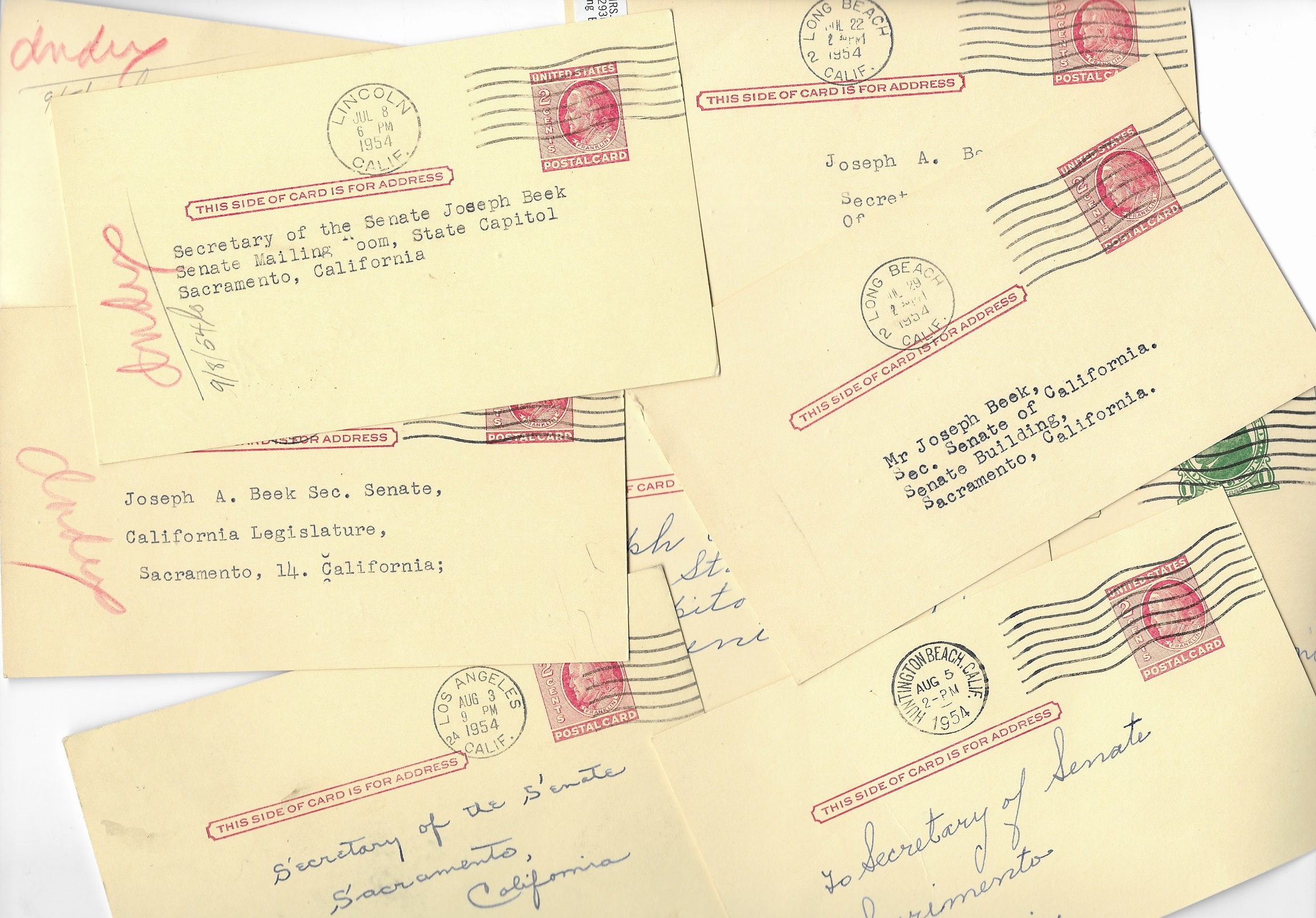 - Senate and Assembly committee cards (used in the 1940s-1950s to inform legislators of upcoming committee meetings)