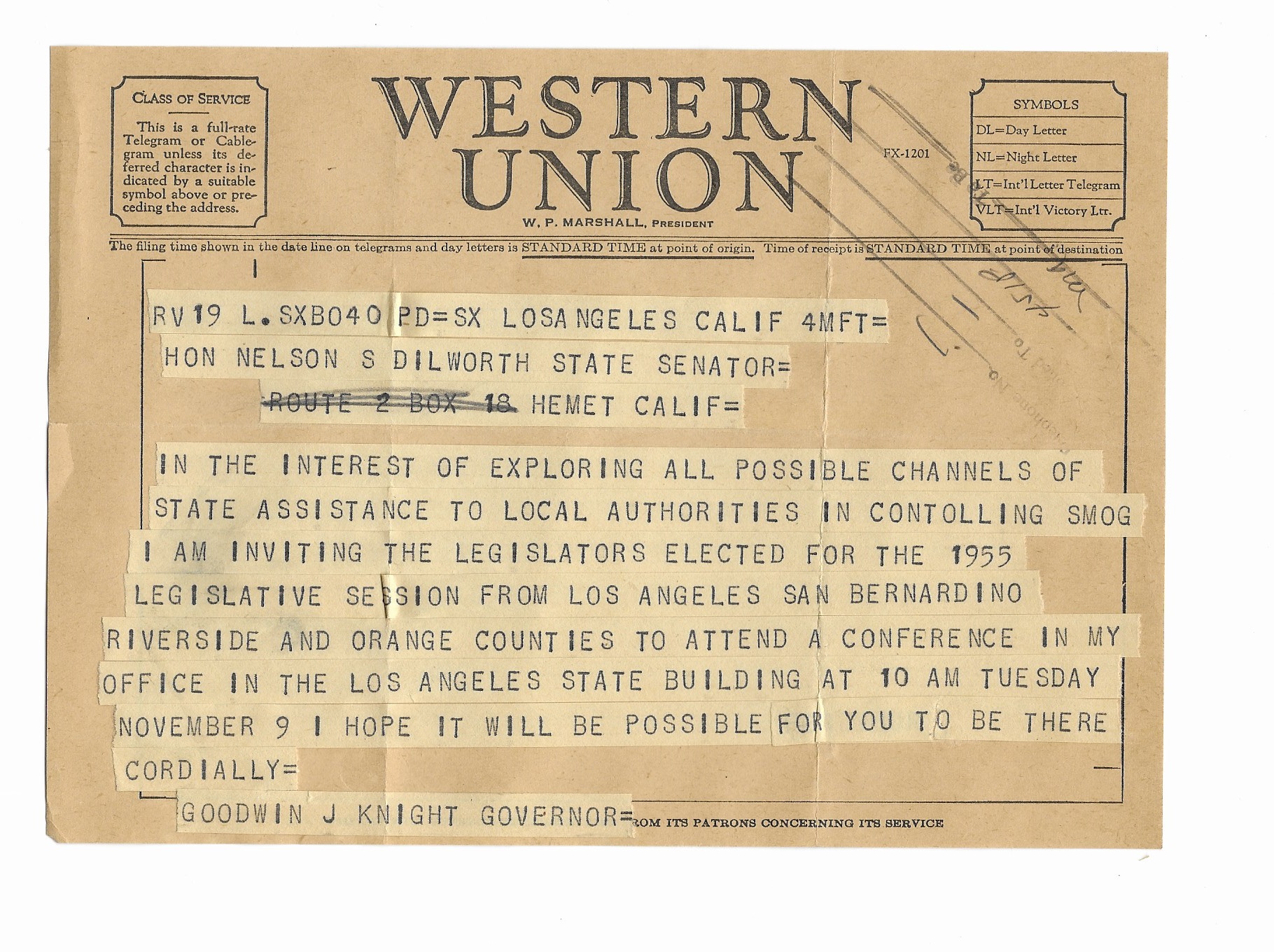 - A telegram from Governor Goodwin Knight about the importance of addressing smog in southern California (1955)