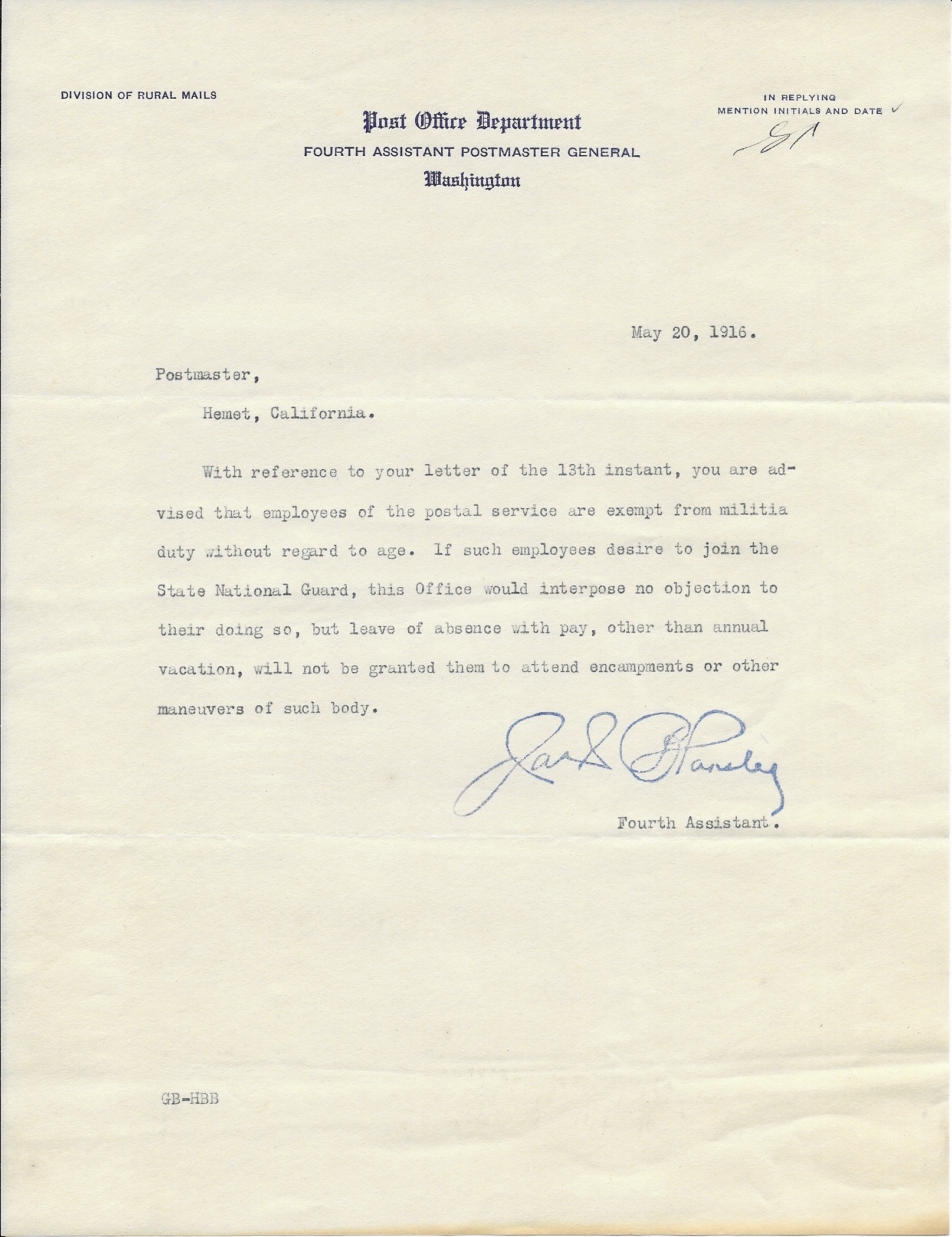 1916 (May 15) A letter from the A letter from the Fourth Assistant Postmaster General about postal employees joining the National Guard