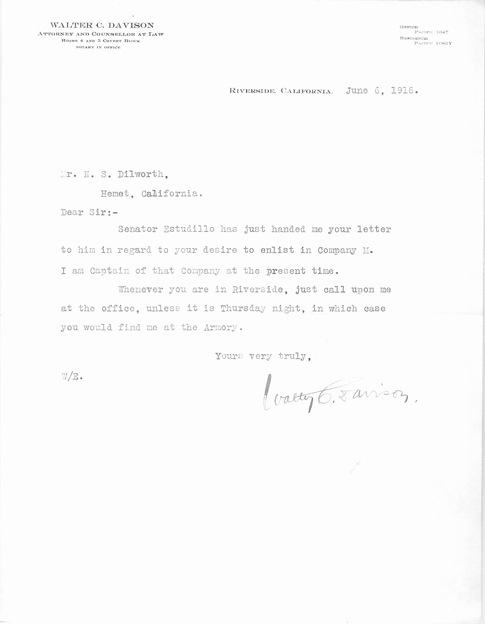 1916 (June 6) Letter California National Guard Captain Walter Davidson about meeting up to discuss membership in the National Guard