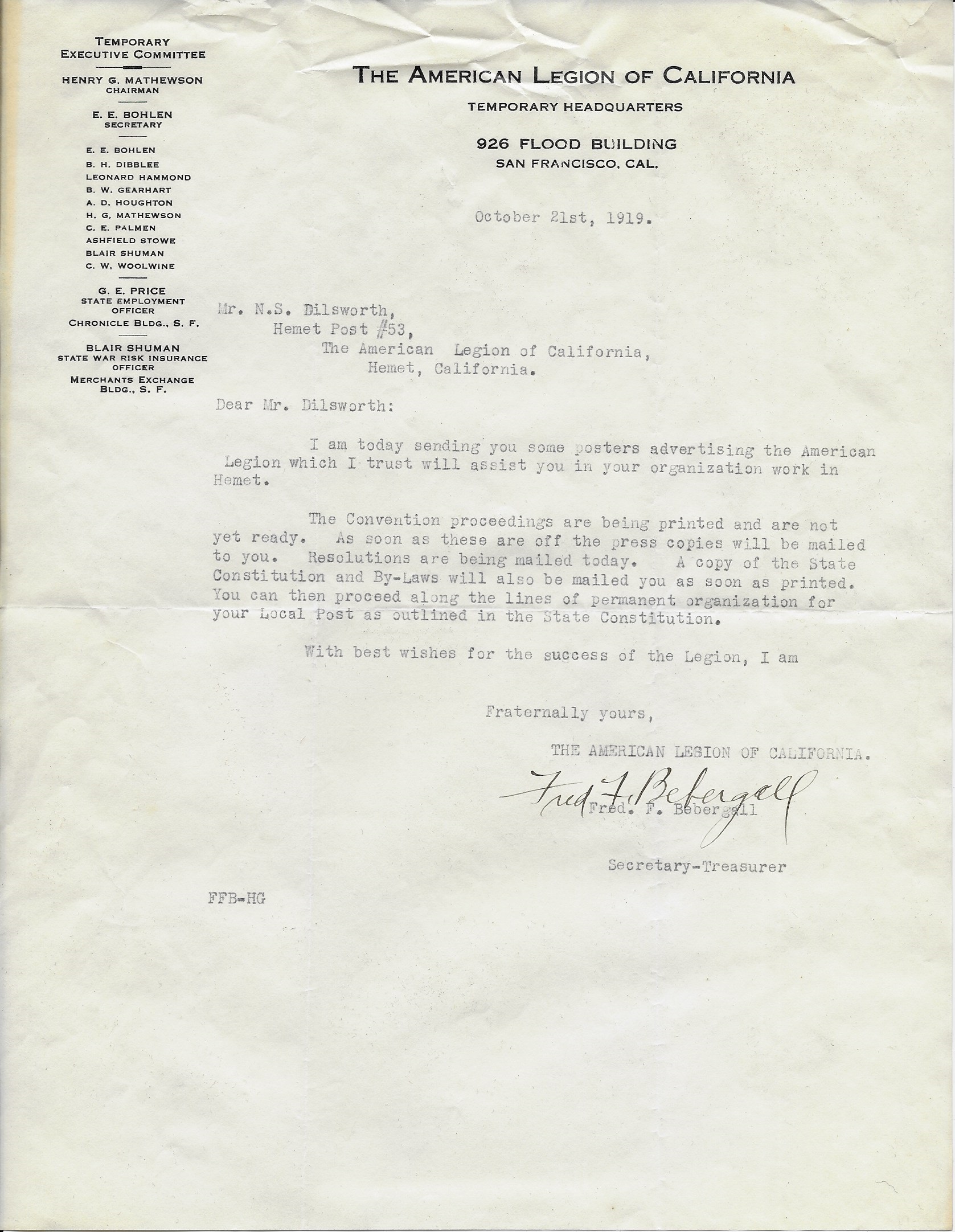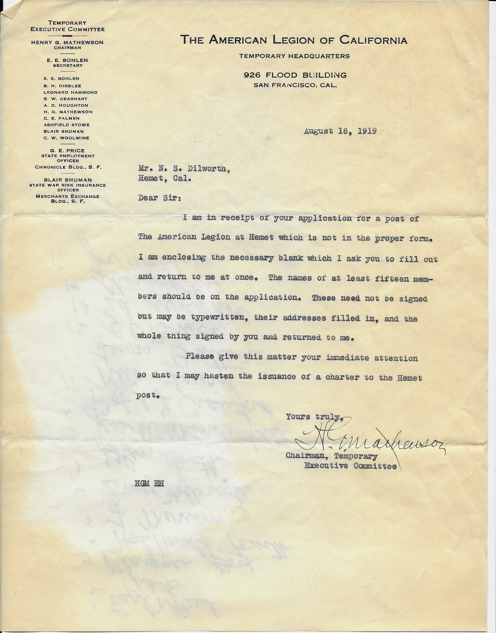 1919 (Oct 21) Letter American Legion re new Hemet Post