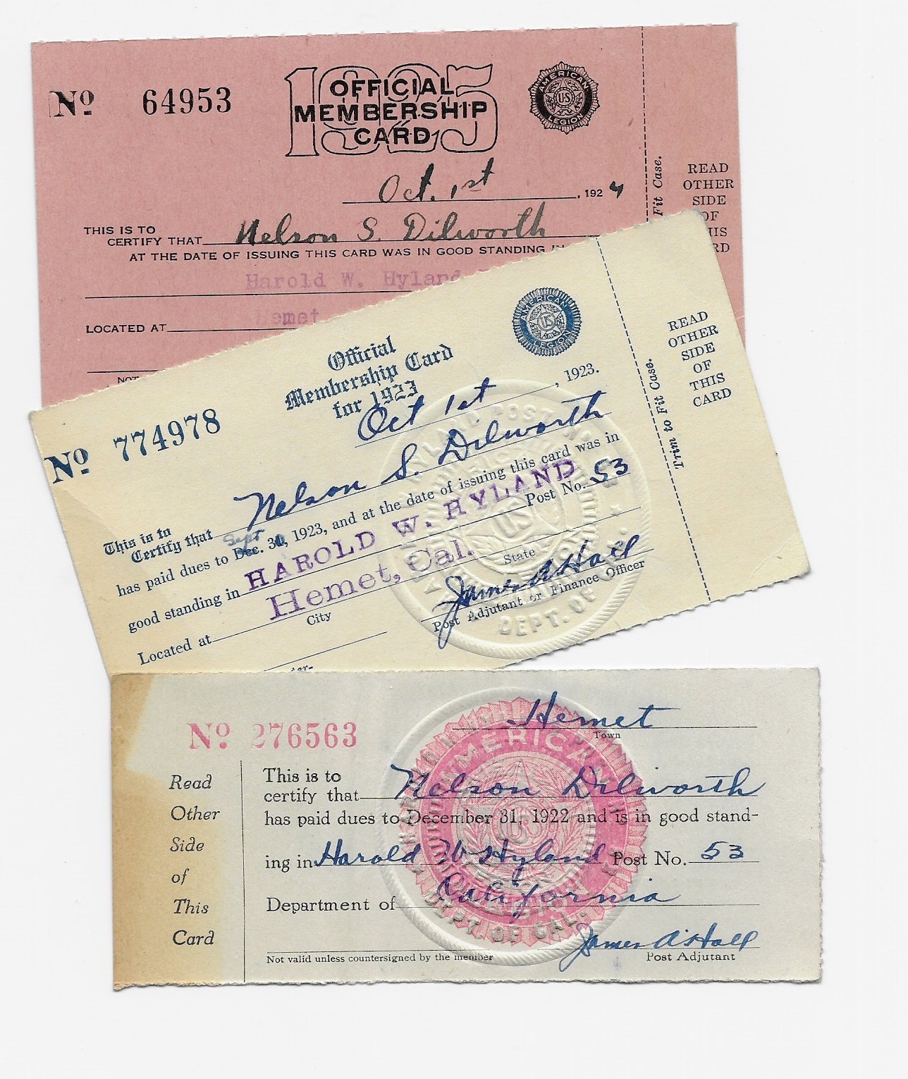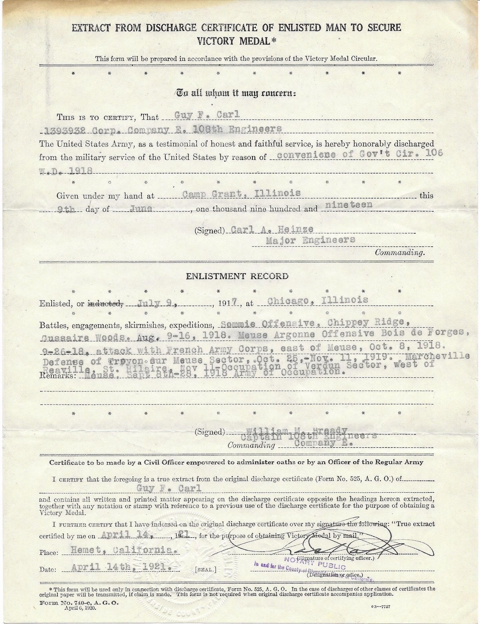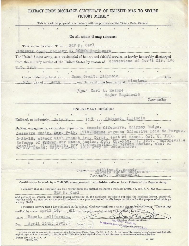 1921 (April 14) A notarized application by Guy F. Carl of Hemet for a WWI Victory Medal