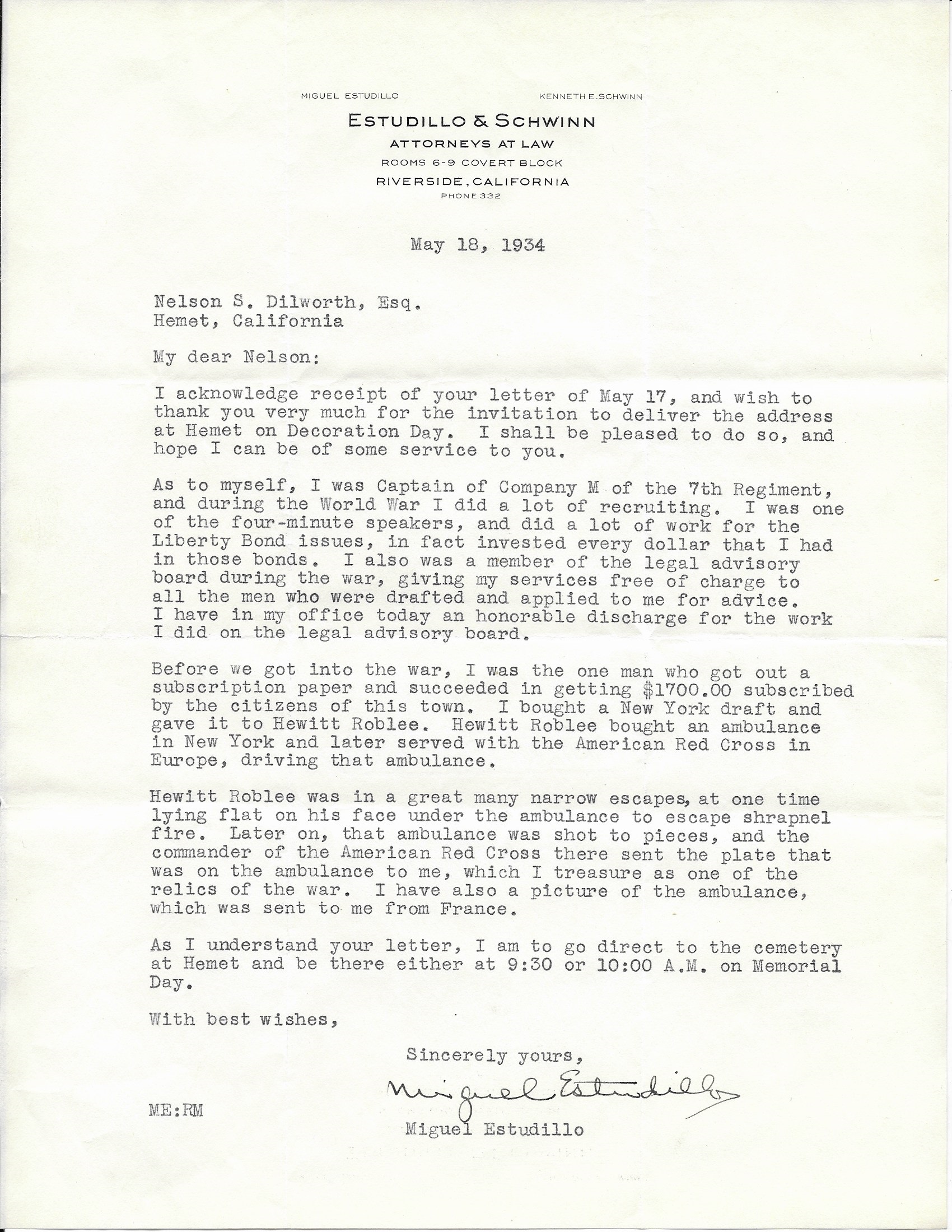 1934 (May 18) Letter from former State Senator Miguel Estudillo about his service in WWI