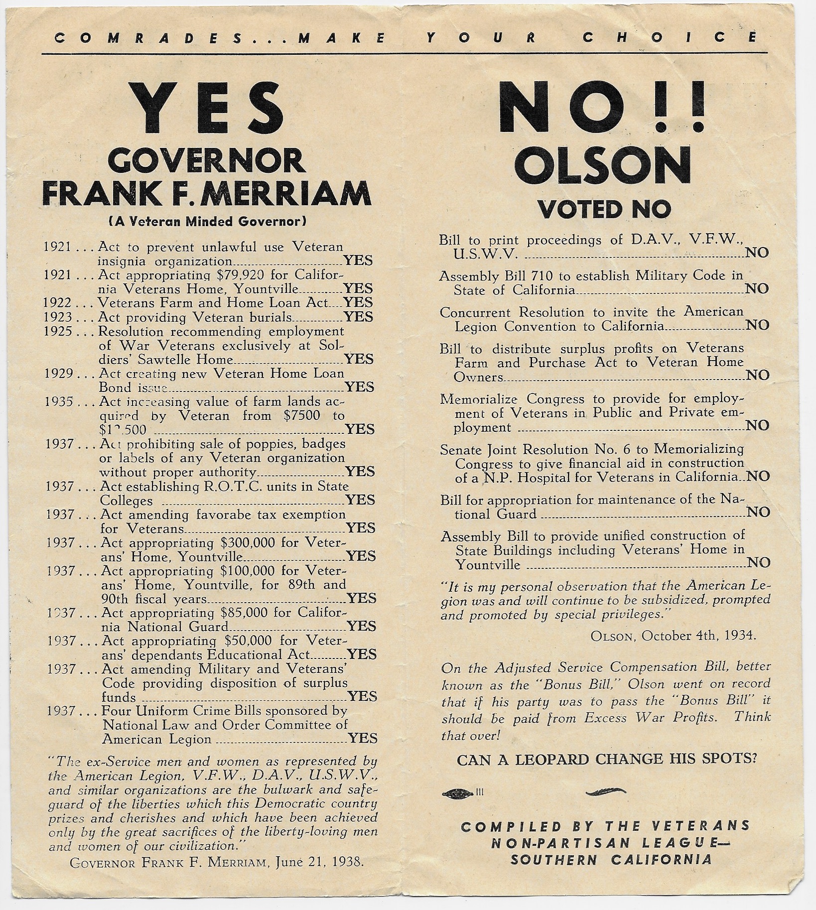 1938 (Nov 1) Campaign flyer from the Veterans Nonparisan League regarding the gubernatorial contest between Merriam and Olson