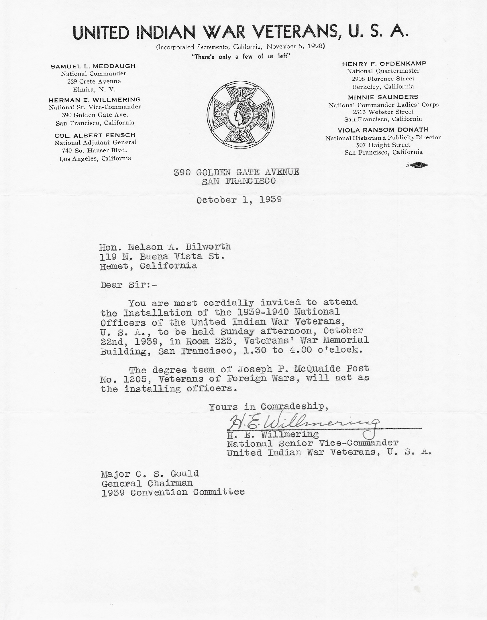 1939 (Oct 1) Letter Indian War Veterans re event invitation