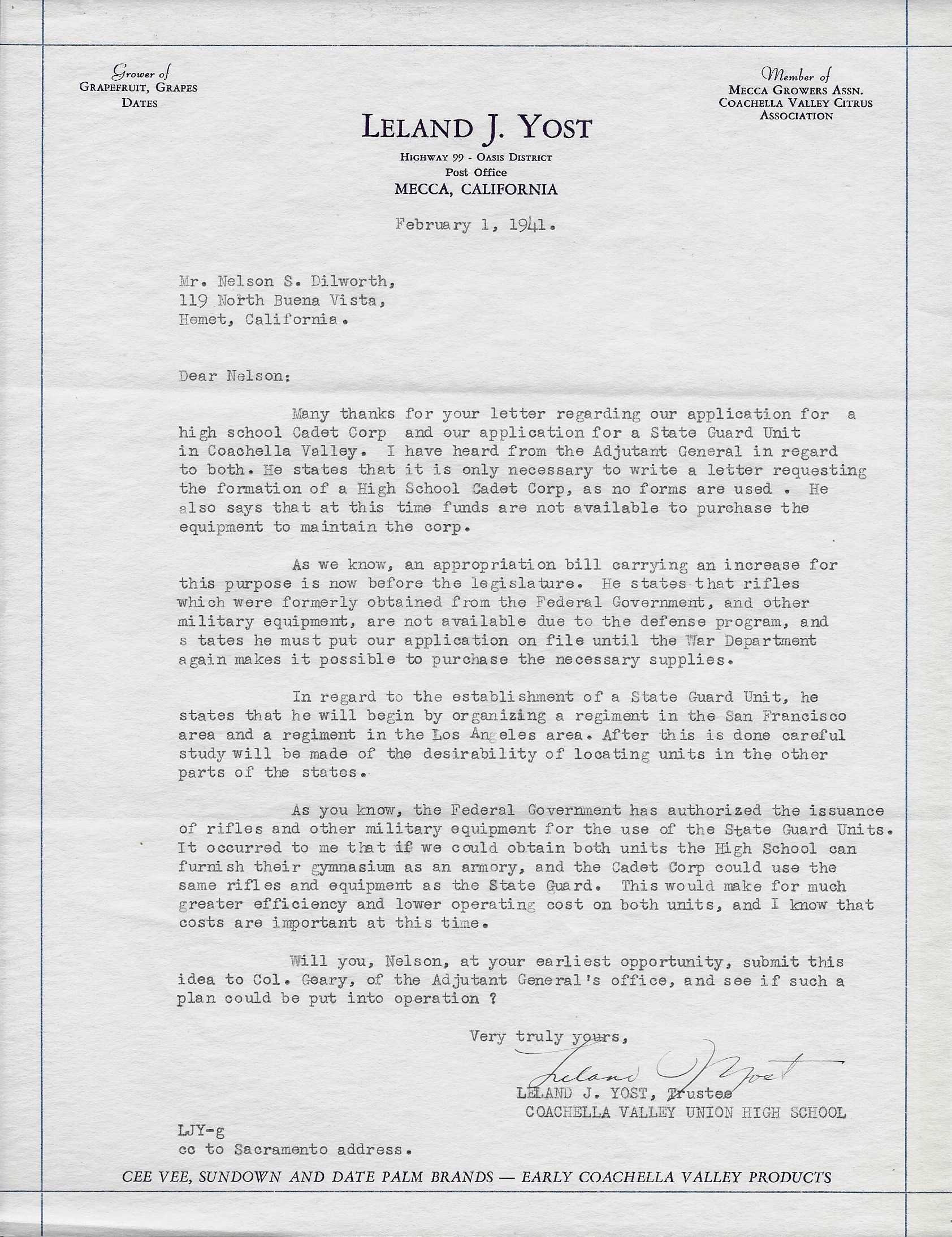 1941 (Feb 1) Letter from Leland Yost about the California State Guard and High School Cadet Corps