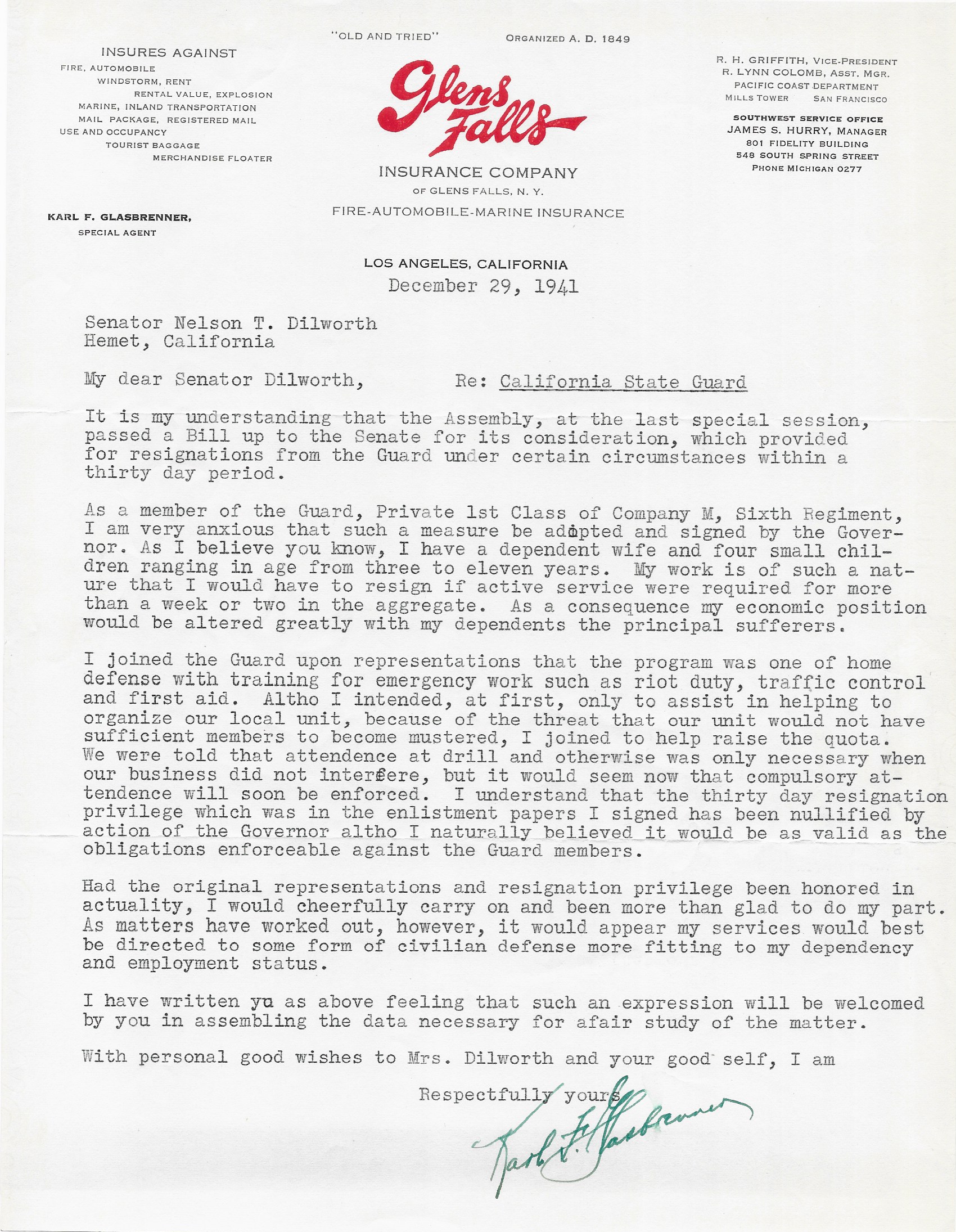 1941 (Dec 29) Letter from Karl Glasbrenner at Glen Falls Insurance about the State Guard Bill and his status as a Private First Class in the State Guard.