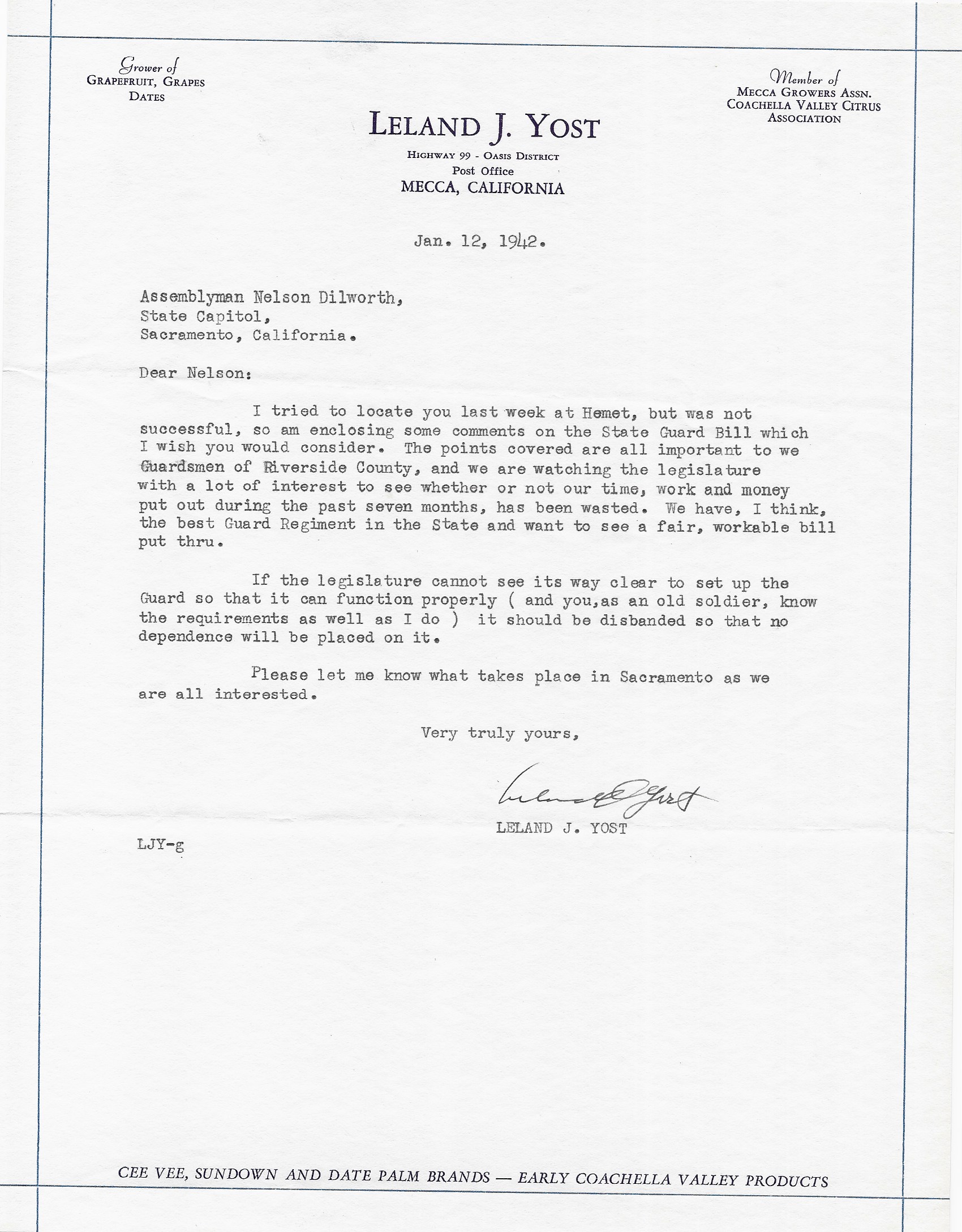 1942 (Jan 12) Letter from Leland Yost about the State Guard bill