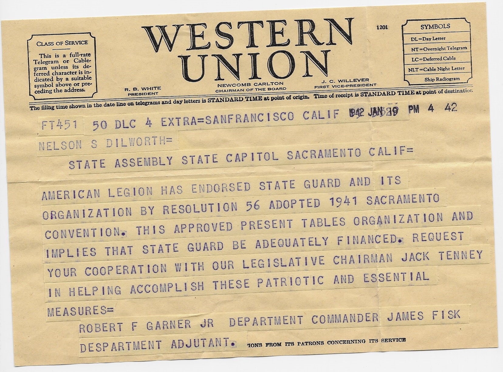 1942 (Jan 19 Telegram from American Legion regarding the State Guard bill