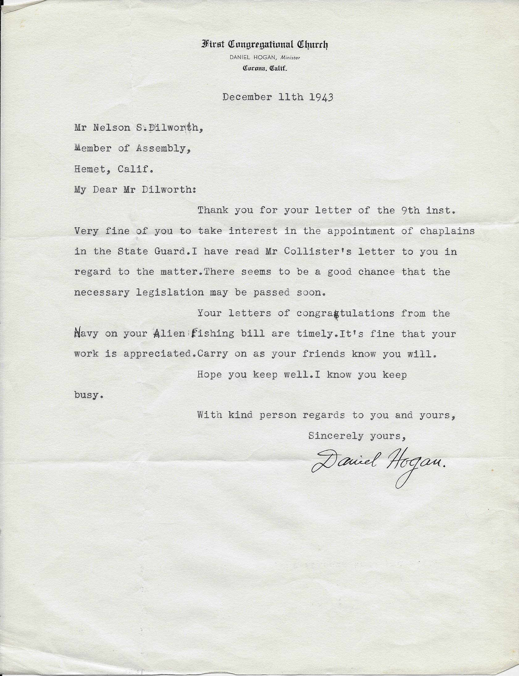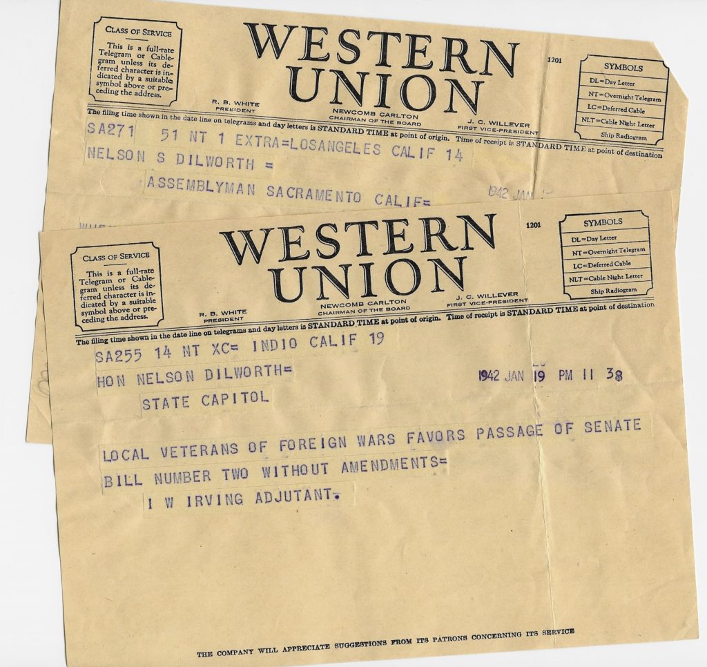 As a veteran of World War I, as an active member of the American Legion, and in his official capacity as a member of the State Senate Military and Veterans’ Committee, Nelson Dilworth had a lengthy involvement in California’s military history. From his interactions with veterans of the Civil War and Indian Wars to his role as a lawmaker during World War II, Dilworth worked to build the state’s strategic importance, while also working to expand services to veterans. Dilworth also had a front row to the federal internment of Japanese Americans during the war.