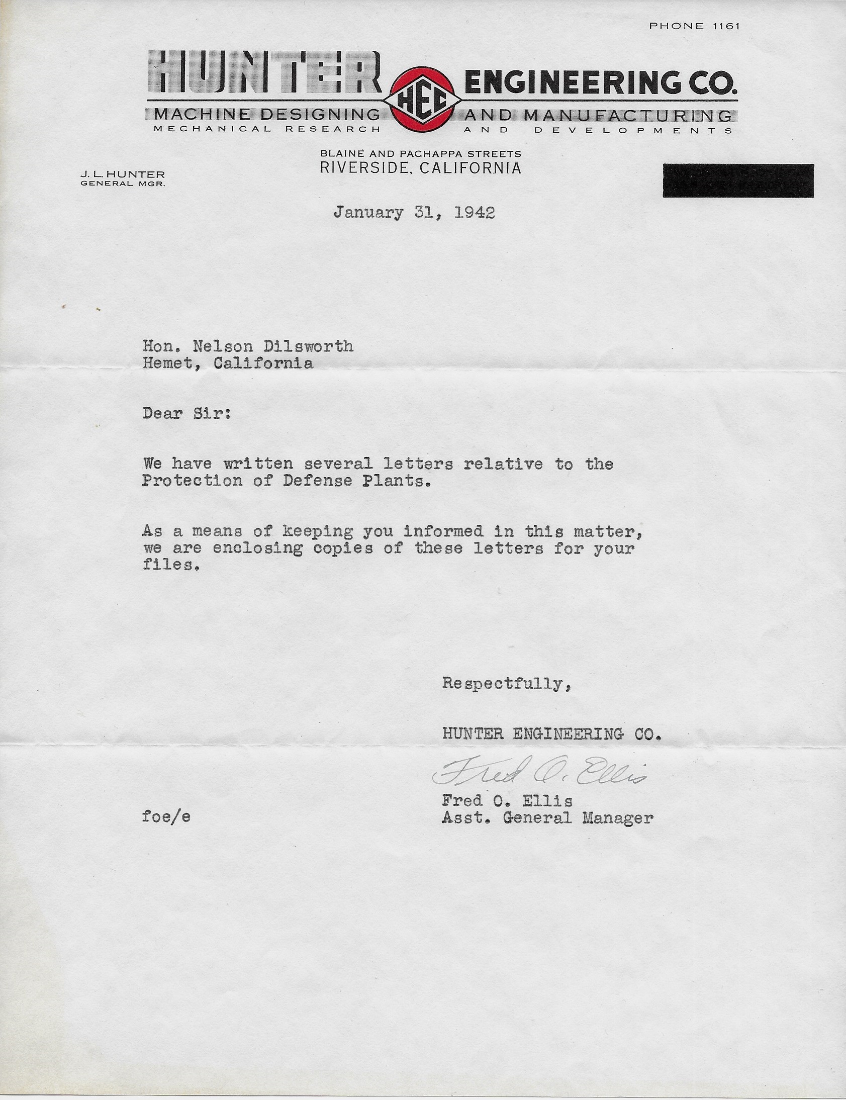 1942 (Jan 31) A letter from Hunter Engineering (of Riverside) regarding their application to receive military protection as a defense plant.