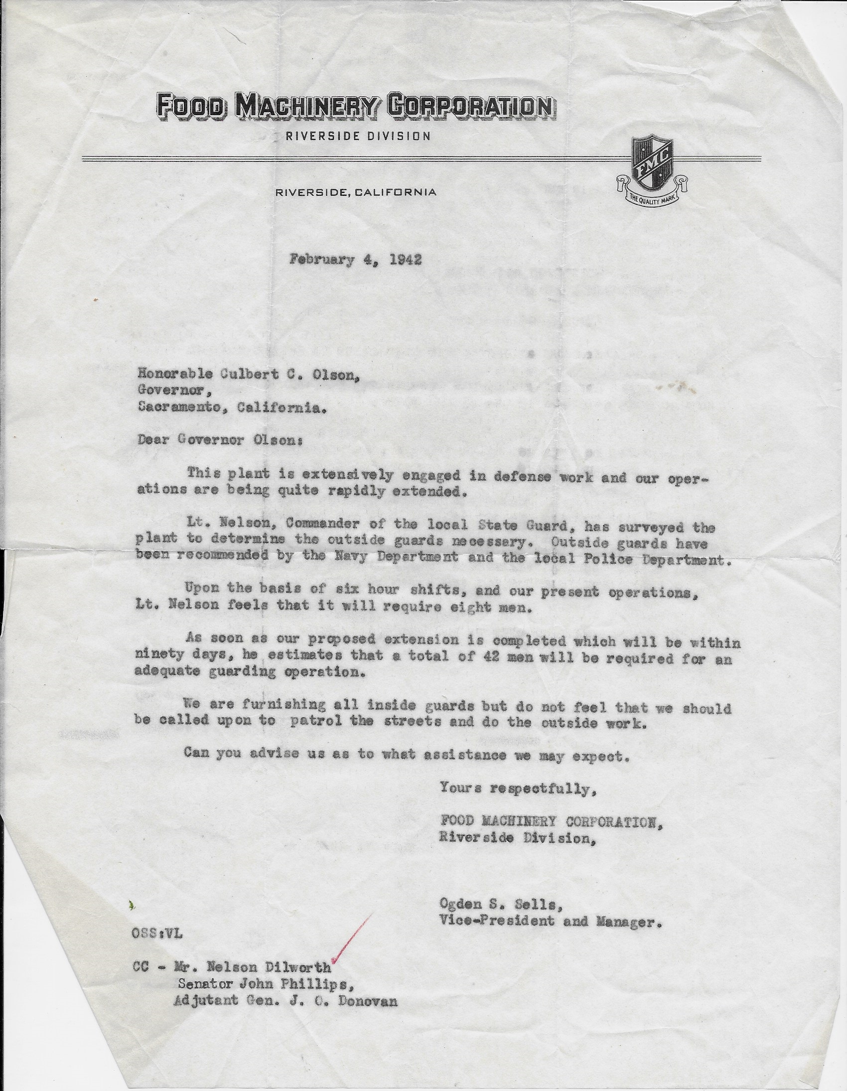 1942 (Feb 4) A letter from the Food Machinery Corporation regarding their plant being “extensively engaged in defense work” and working with the military to get police protection.
