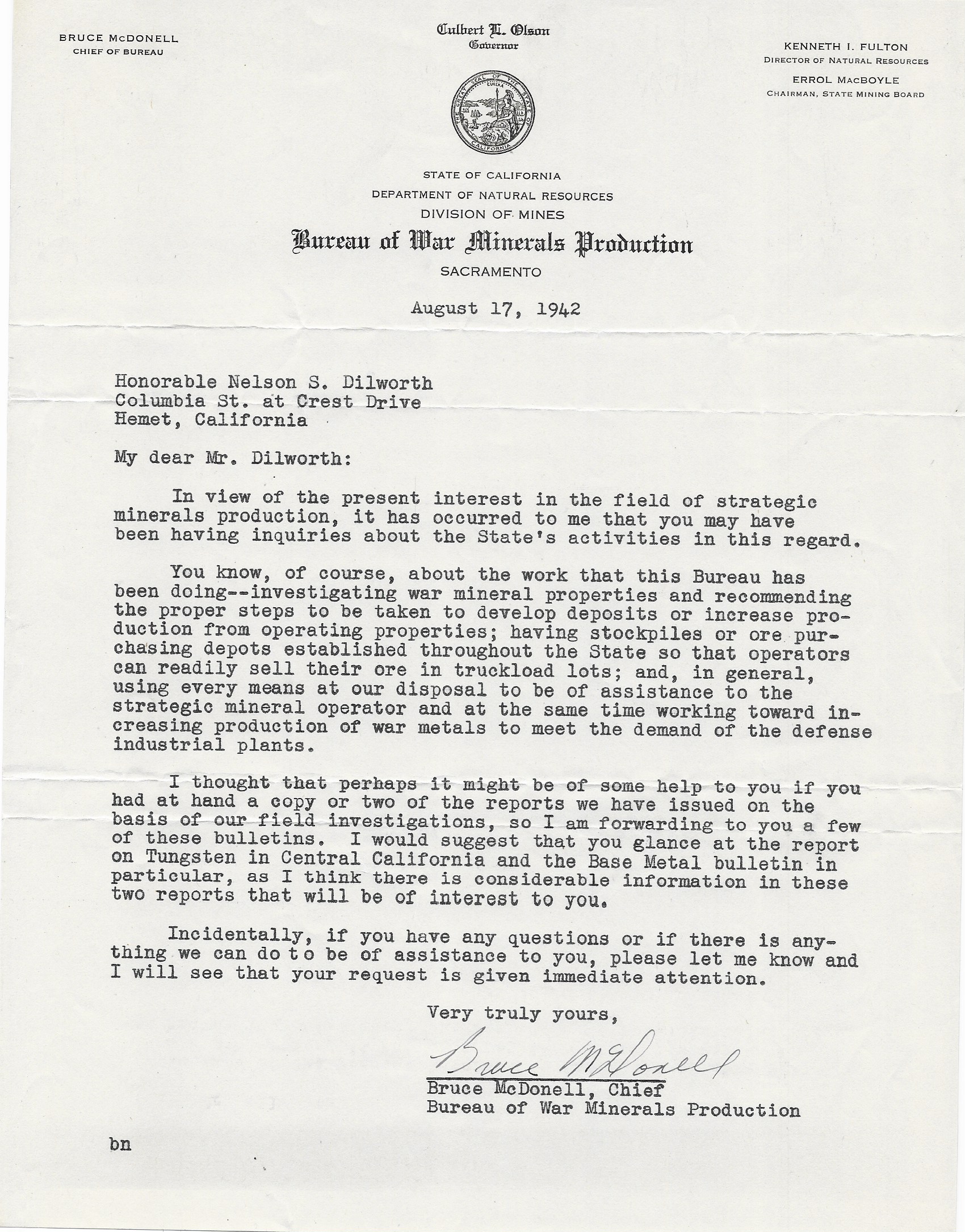 1942 (Aug 17) A 1942 letter from the California Bureau of War Minerals Production regarding the production of strategic minerals (including tungsten)