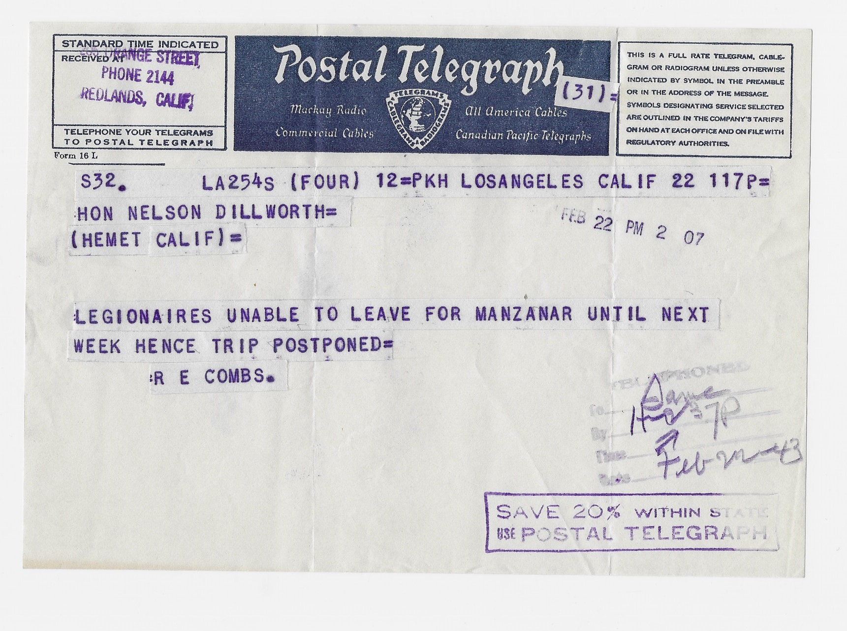 1943 (Feb 22) Telegram R E Combs re Am Legion visit to Manzanar