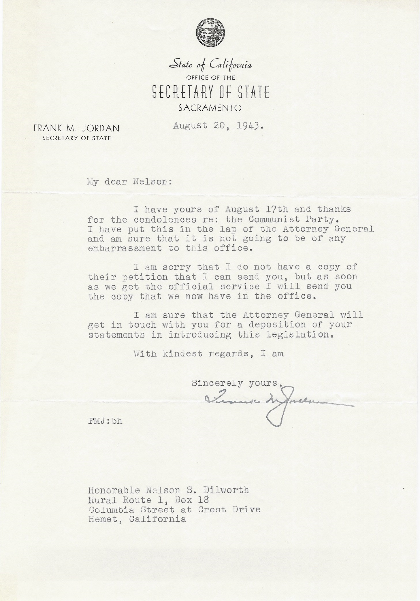 1943 (Aug 20) Letter SOS Frank M Jordan re Communist ballot law