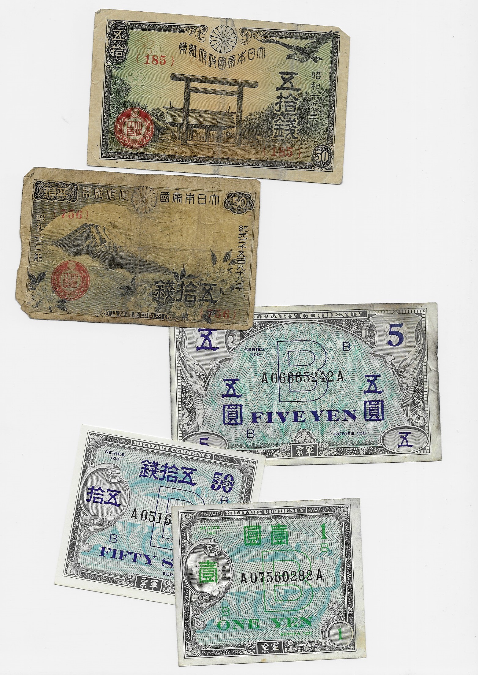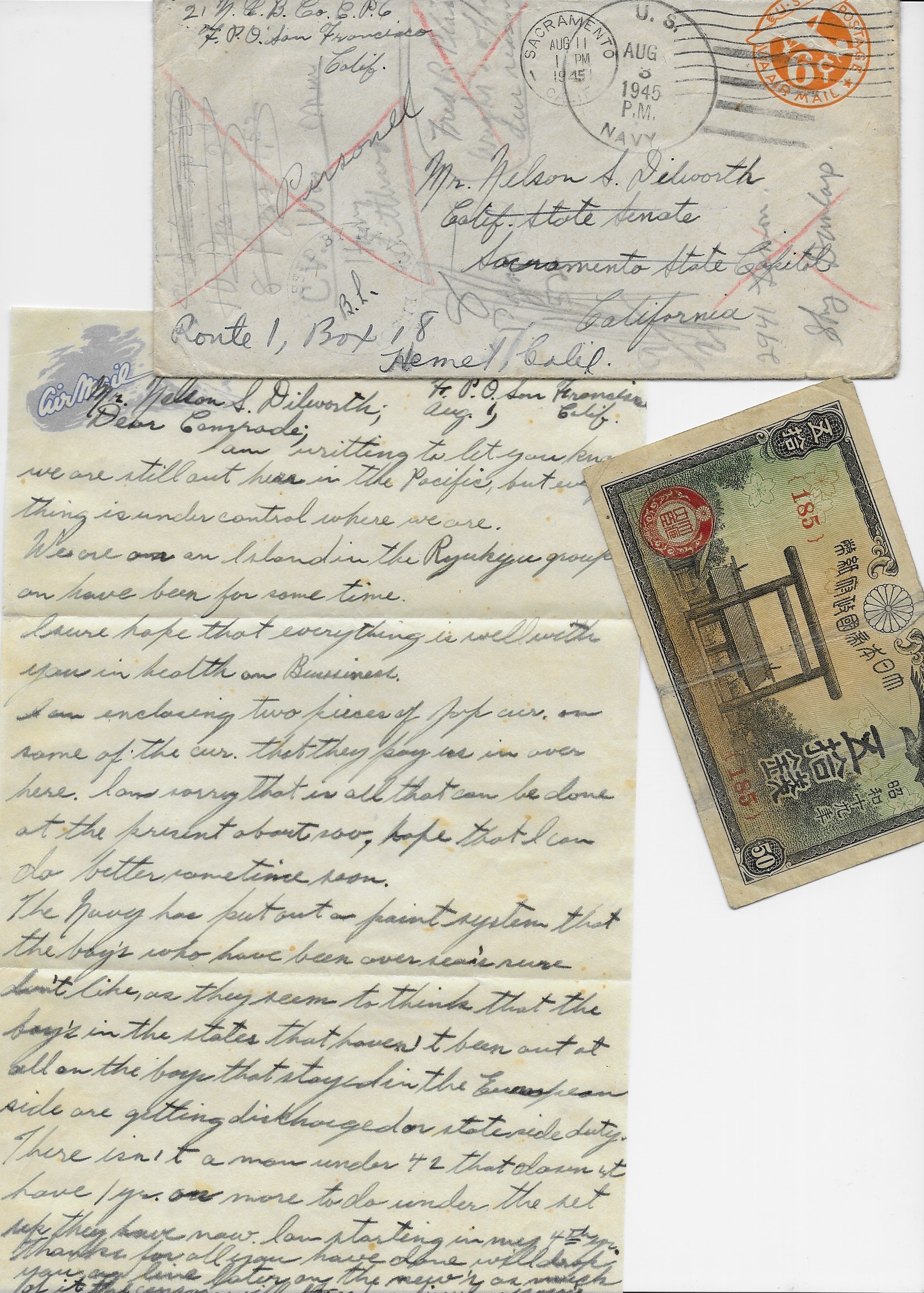 1945 (June 5) A letter written in August 1945 by a sailor on a ship near the Ryukyu Islands (and a sample of the local currency used there during the war)