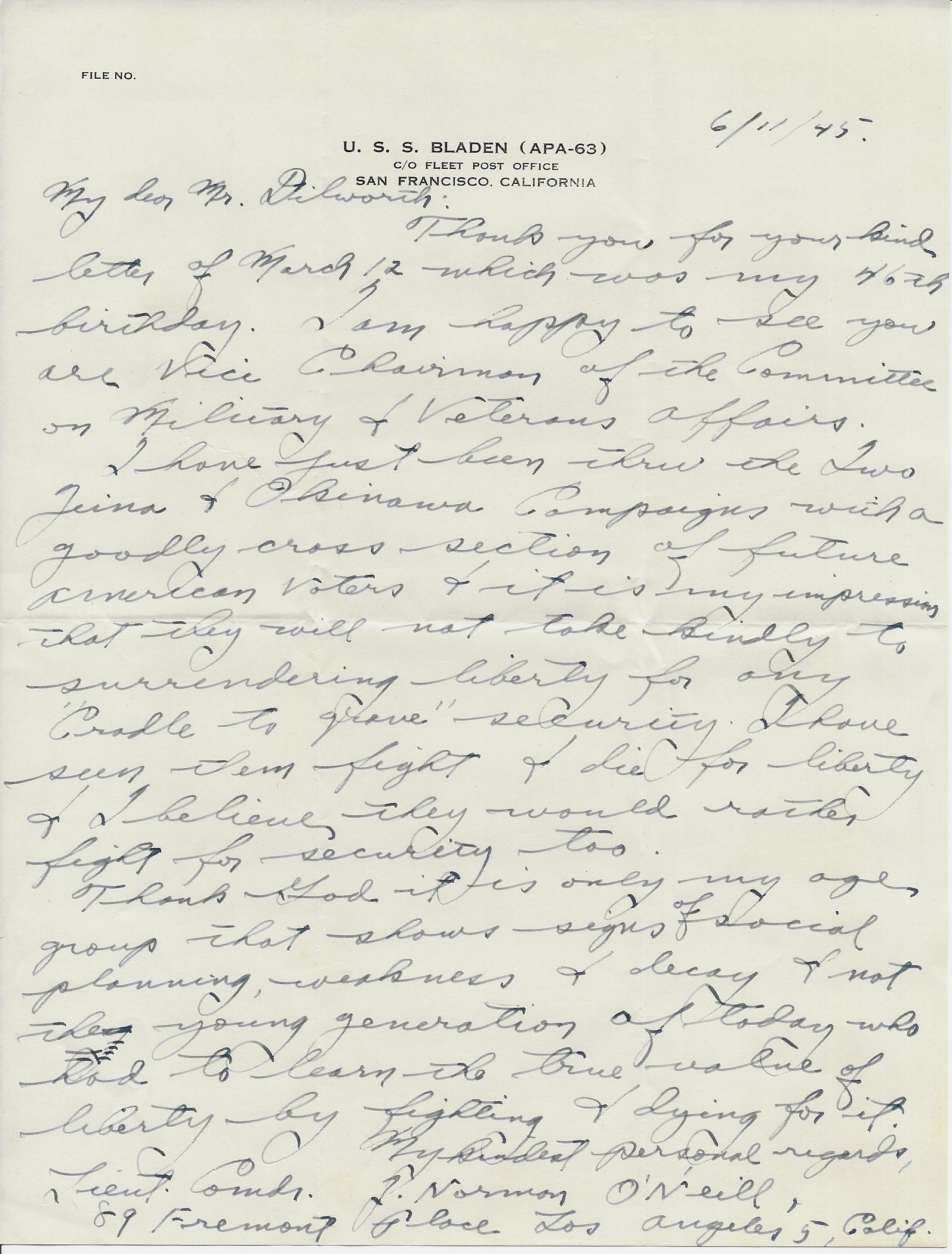 1945 (June 11) Letter J Norman Oneill USS Bladen re UNKNOWN