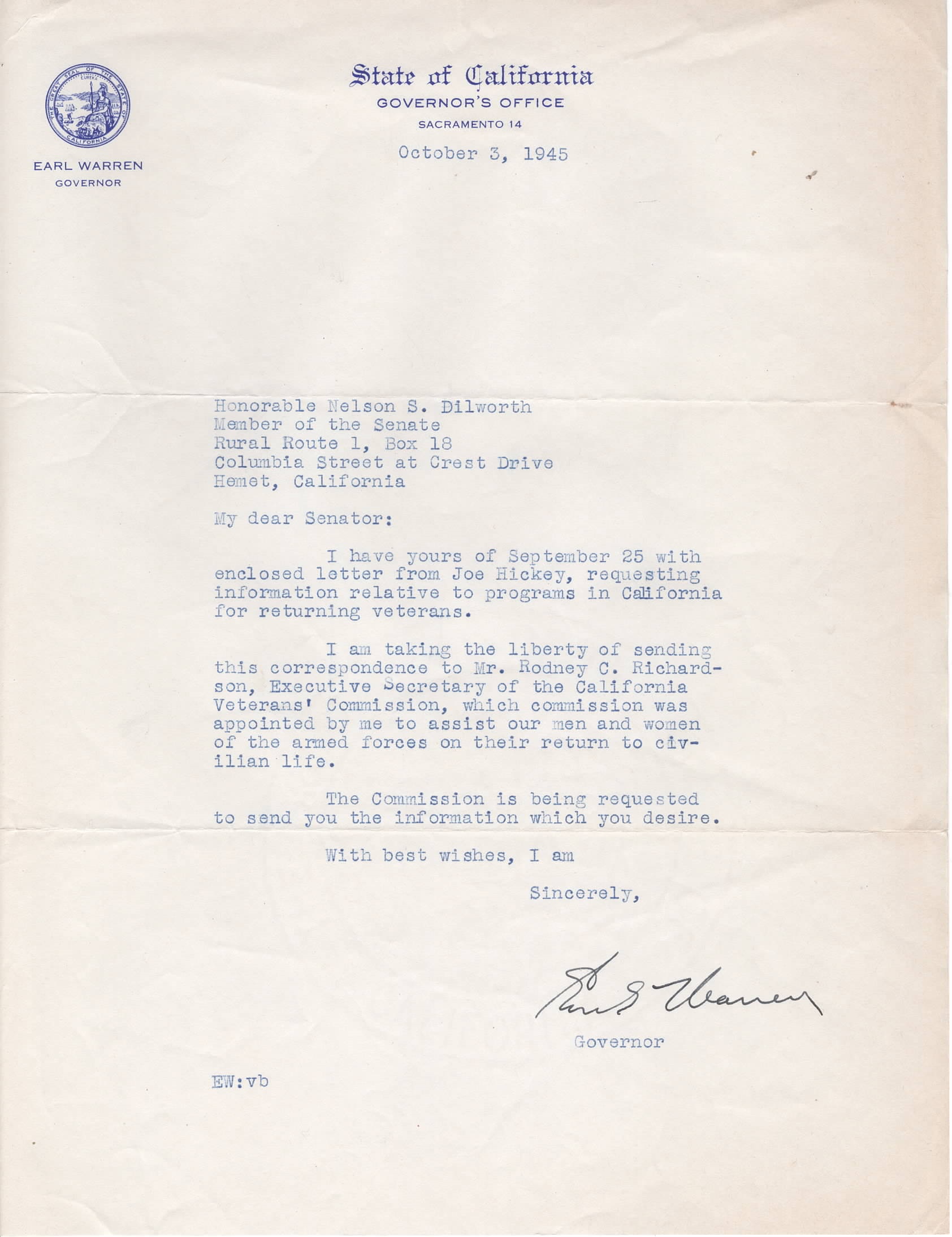 1945 (Oct 3) Letter from Governor Earl Warren about returning veterans