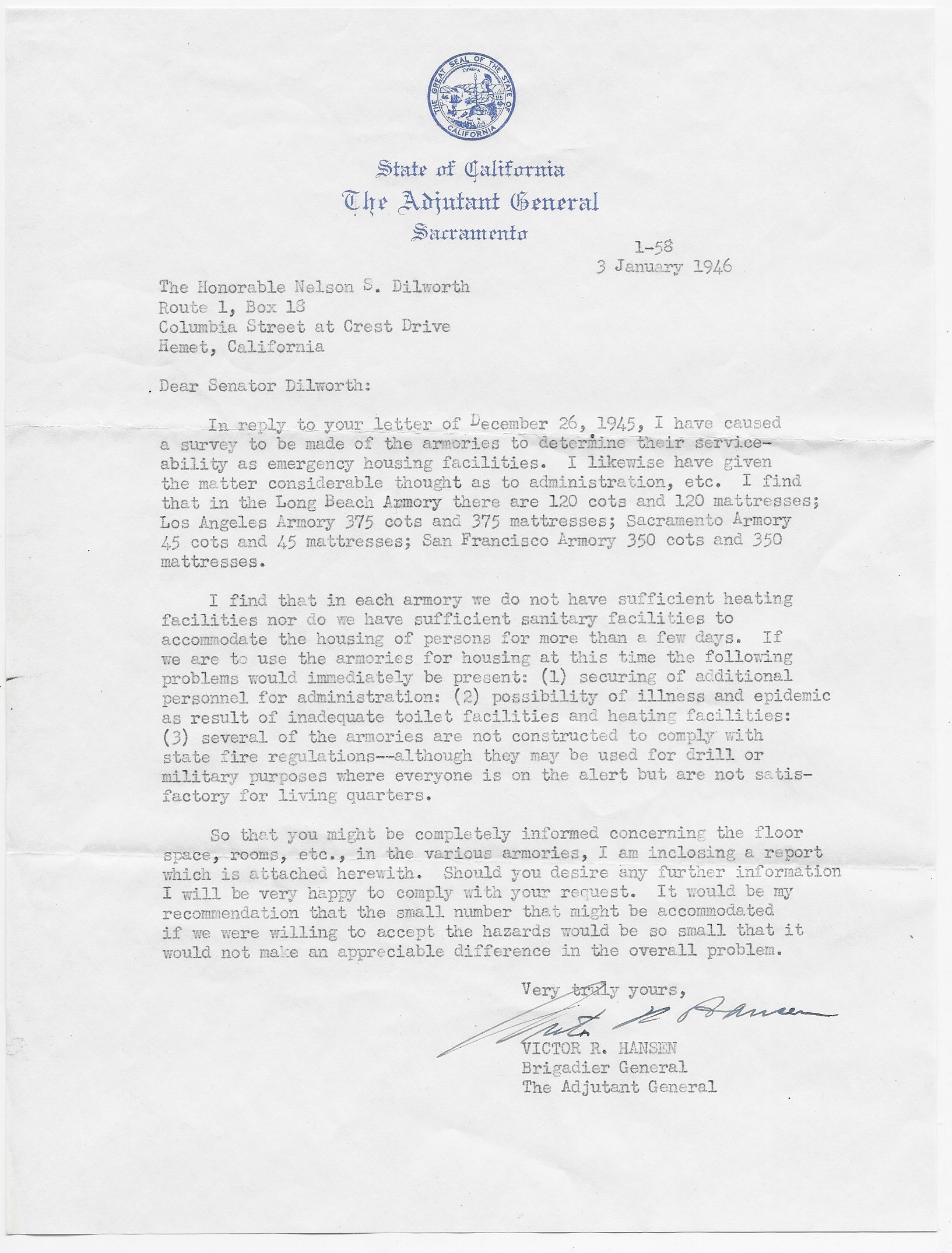 1946 (Jan 3) Letter from the California Adjutant General Victor Hansen re armories