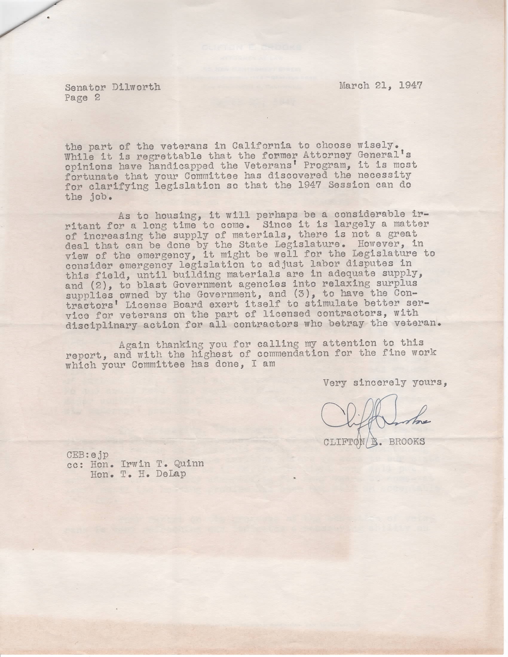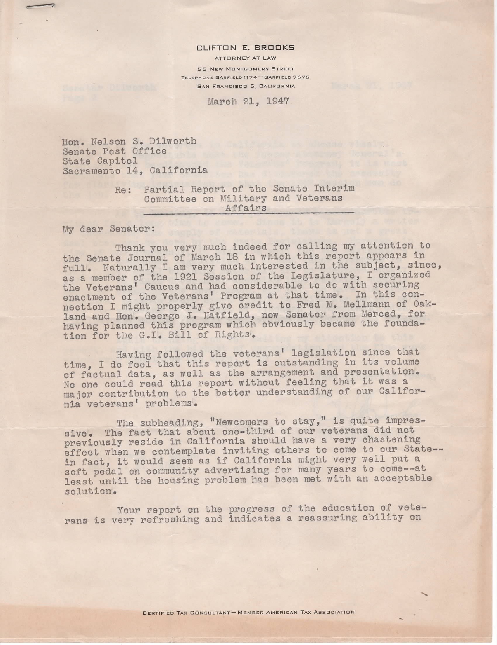 1947 (Mar. 21) Letter from Clifton Brooks (a veteran of World War I who served two terms in the State Assembly immediately after the war) about veterans legislation (page 1 and page 2)