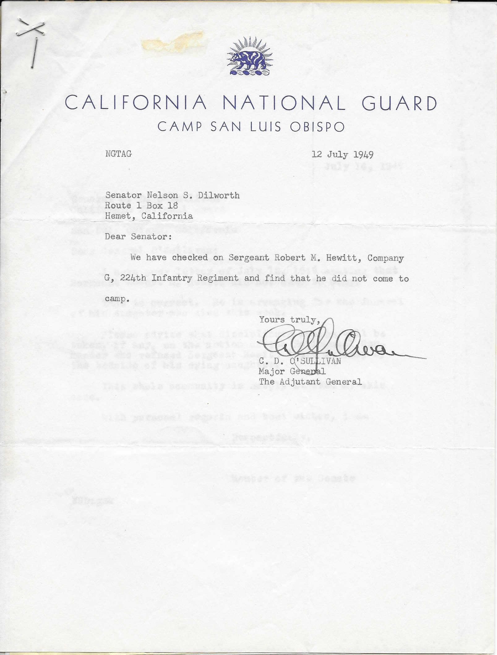 1949 (July 12) Letter from the National Guard regarding a missing soldier