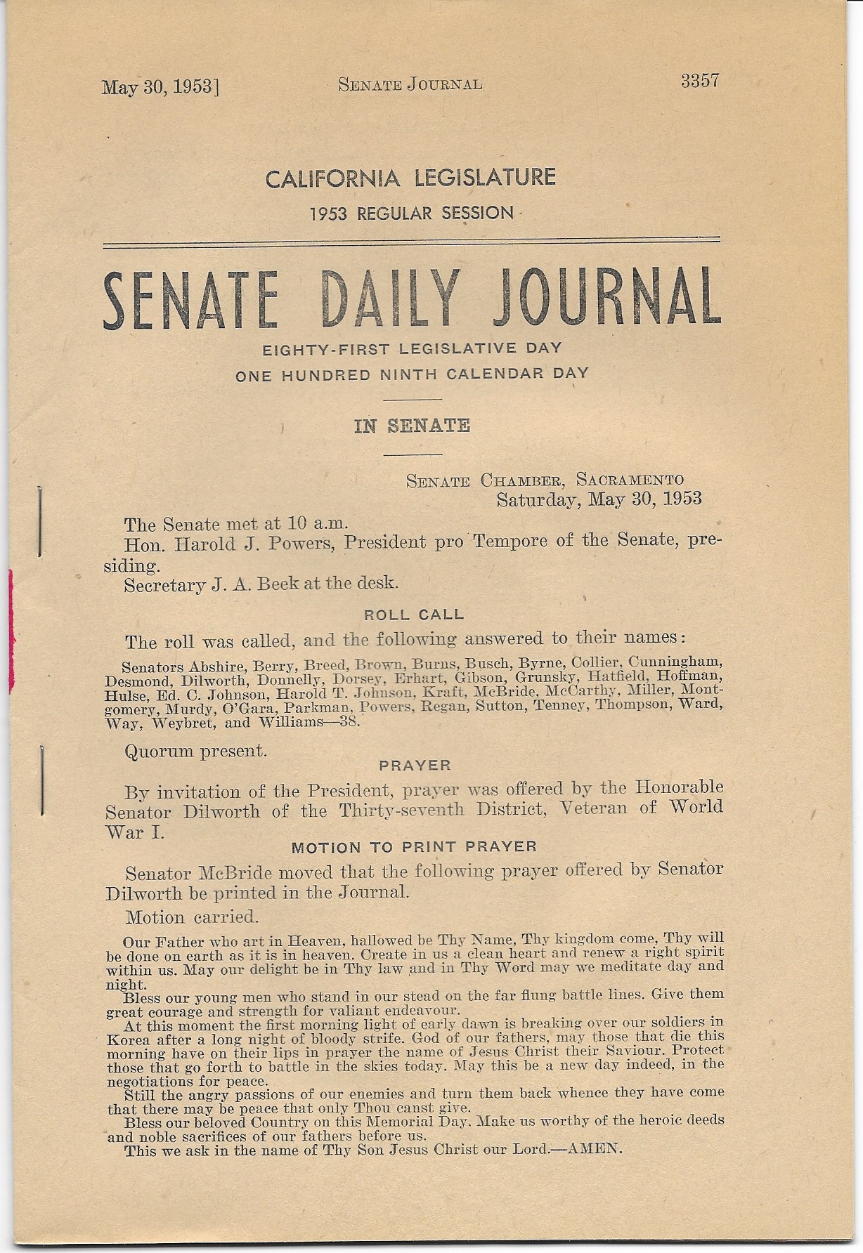1953 (May 30) Senate Daily Journal with a Memorial Day prayer for the soldiers in Korea by Nelson Dilworth: “Bless our young men who stand in our stead on the far flung battle lines. Give them great courage and strength for valiant endeavor. At this moment the first morning light of early dawn is breaking over our soldiers in Korea after a long night of bloody strife.”