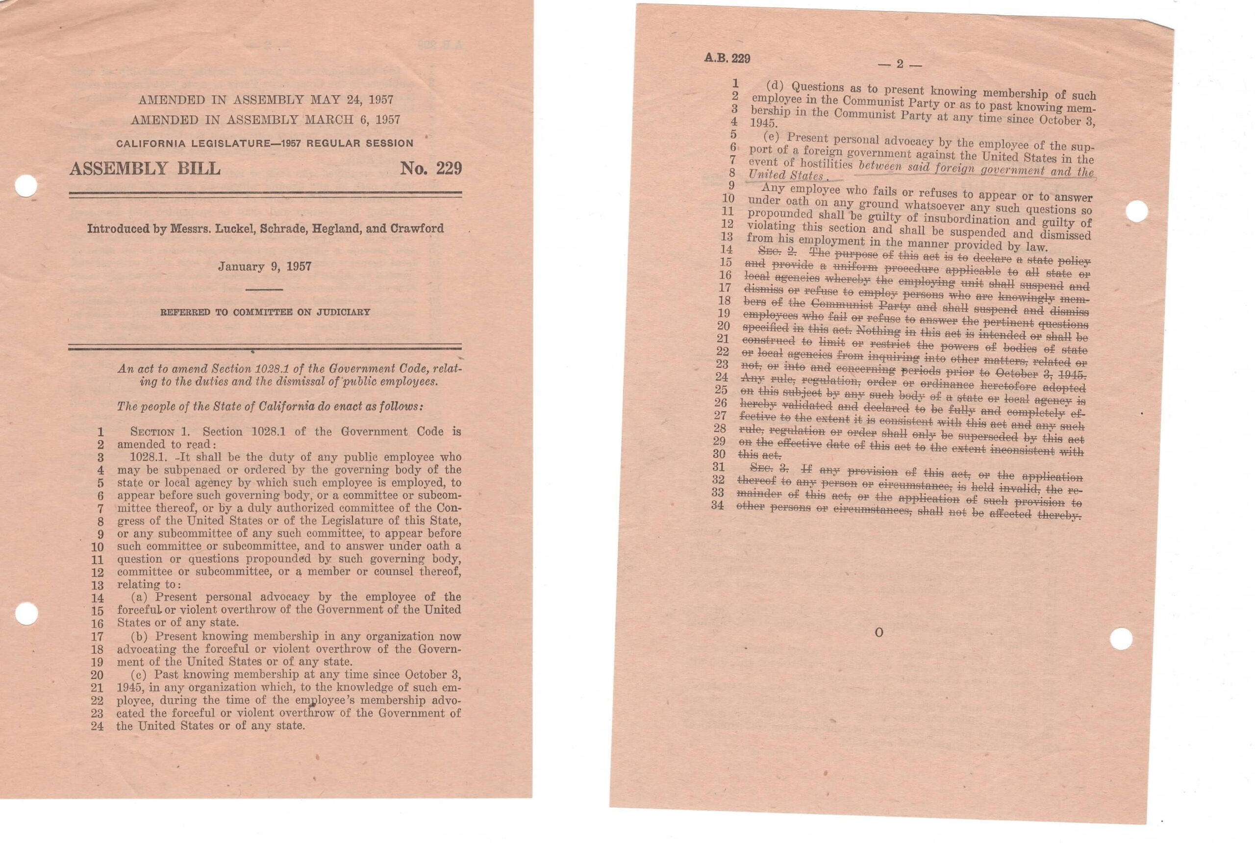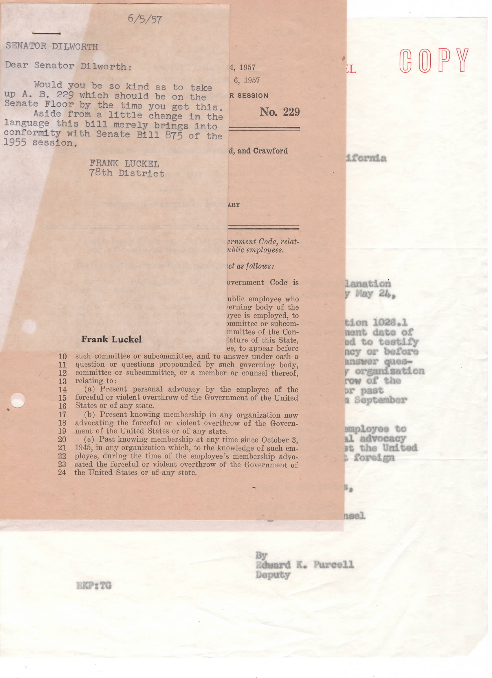 1957 (June 5) One example of legislation attempting to limit the employment of communists as California state employees is Assembly Bill 299 of 1957 by Assemblyman Frank Luckel. Additionally, found with the bill was a note from Assemblyman Luckel asking Dilworth to present the bill when it arrives on the Senate floor.