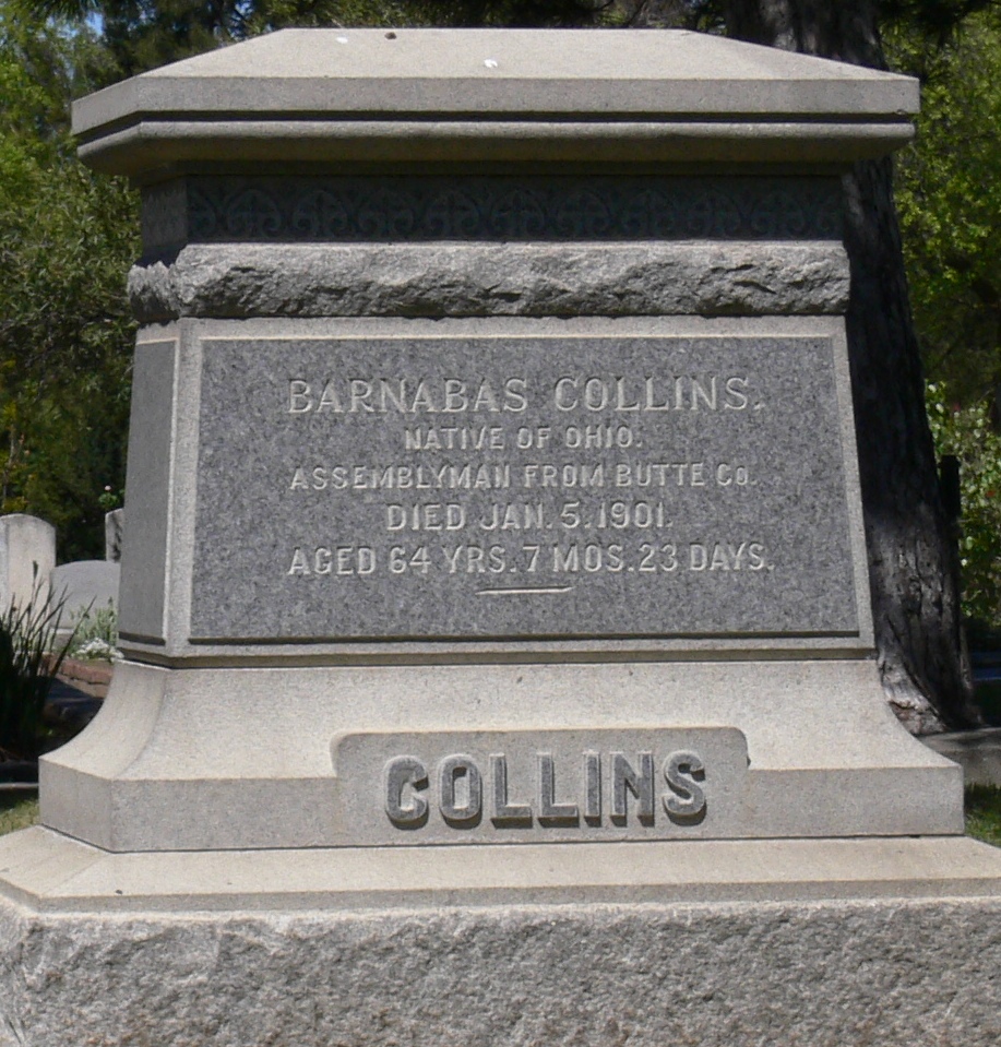 Today, Collins remains the the only “Barnabas” ever elected to partisan office in California. His grave is located eleven blocks from the State Capitol in a section of Sacramento City Cemetery near those of Hardin Bigelow, John C. Bell, and Governor William Irwin.