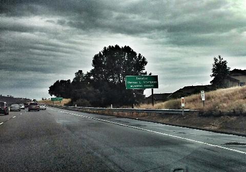 Driving through San Luis Obispo County last weekend, I stopped to photograph several places and things named for California Legislators. The most easily visible was the Senator Vernon L. Sturgeon Memorial Highway.