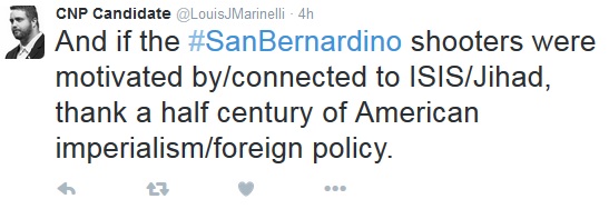 Marinelli also tweeted that the blame for Wednesday’s attack in San Bernardino might fall on “a half century of American imperialism/foreign policy.”