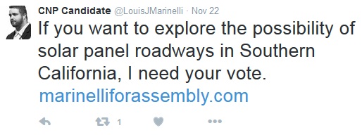 Marinelli has made a number of, what can only be described as significant and creative campaign pledges, including seceding from the United States, moving the UN headquarters to San Francisco, and building solar panel roadways in Southern California.