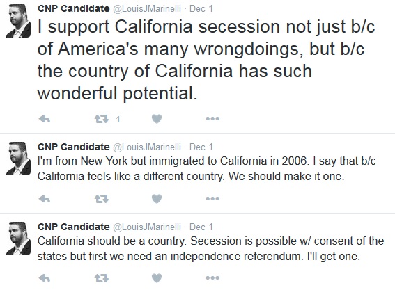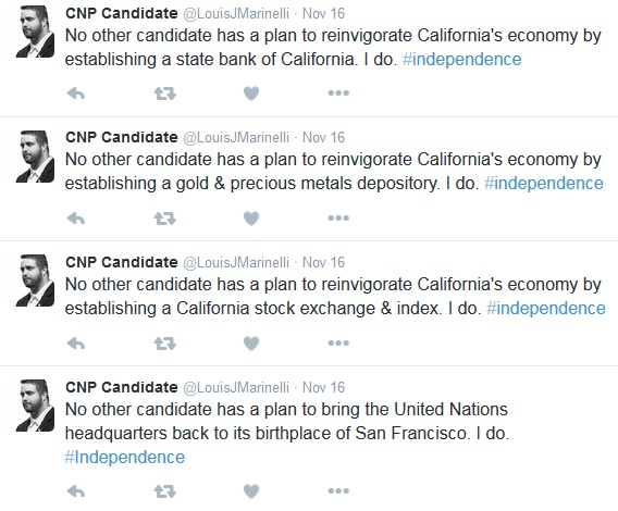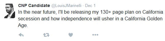 Louis J. Marinelli, is running as a candidate for the California National Party, which advocates California leaving the US to form a new nation. It appears that the party has a Twitter account but is not (according to the Secretary of State’s website) actually trying to qualify for ballot status.